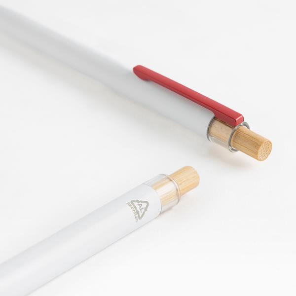 Długopis z recyklingowanego aluminium z detalami z bambusa. Wykonany z aluminium z recyklingu odpadów,wykorzystując procesy topienia i pozyskiwania. Kupując ten długopis, pomagasz zmniejszyć emisję dwutlenku węgla i ograniczyć odpady. Ten długopis z niebieskim wkładem sporograficznym posiada także klik z bambusa, podążając za trendami rynkowymi.