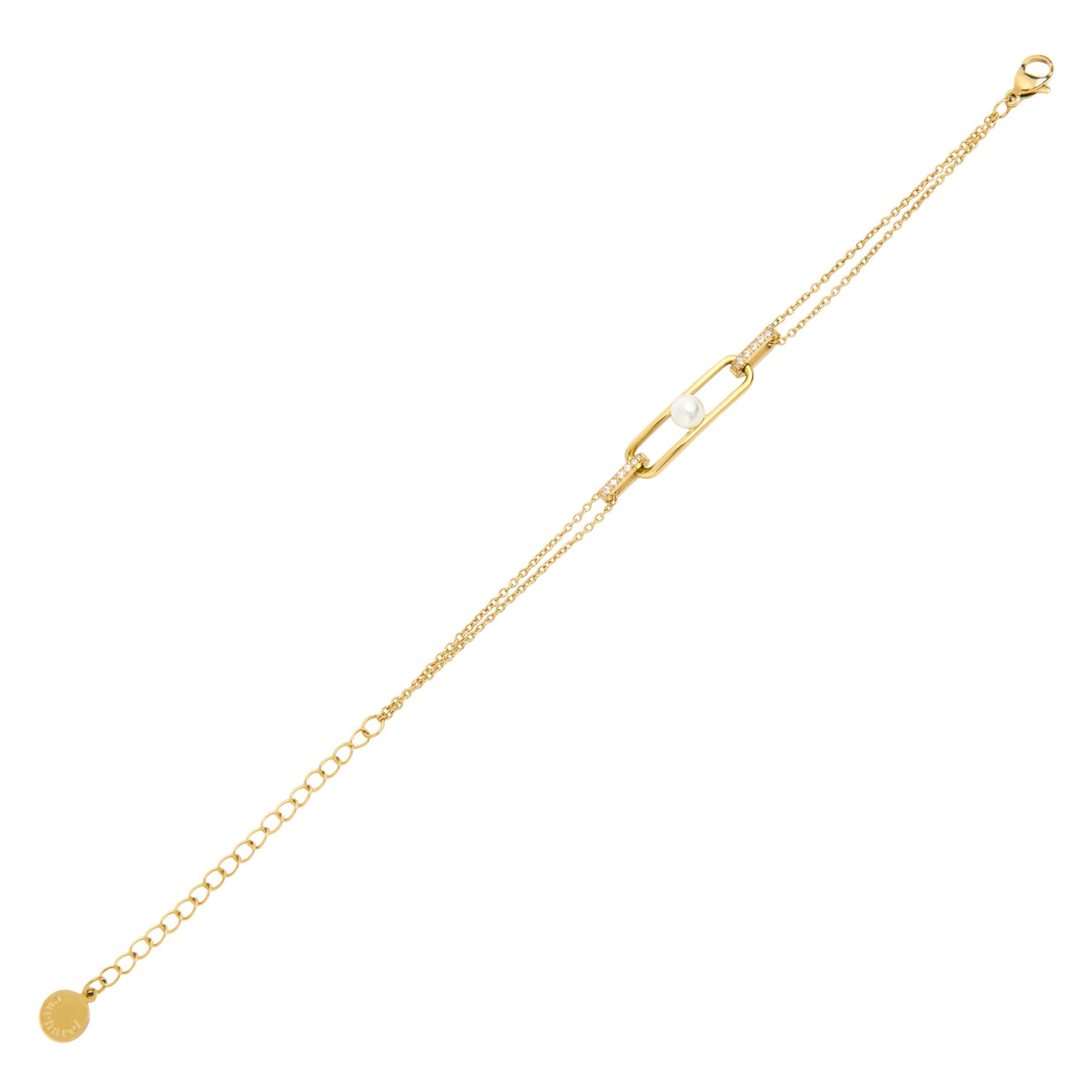 Złota bransoletka `Apolline` łączy elegancję z ponadczasową kobiecością. Delikatność połyskującej białej szklanej perły, inkrustowane kryształowe detale na dwóch ogniwach i owalna zawieszka dodają odrobiny luksusu. Idealnie wszechstronna, ta bransoletka bez wysiłku łączy się z każdą garderobą. Bransoletka `Apolline` wykonana jest ze stali szlachetnej, kryształu i białej szklanej perły.