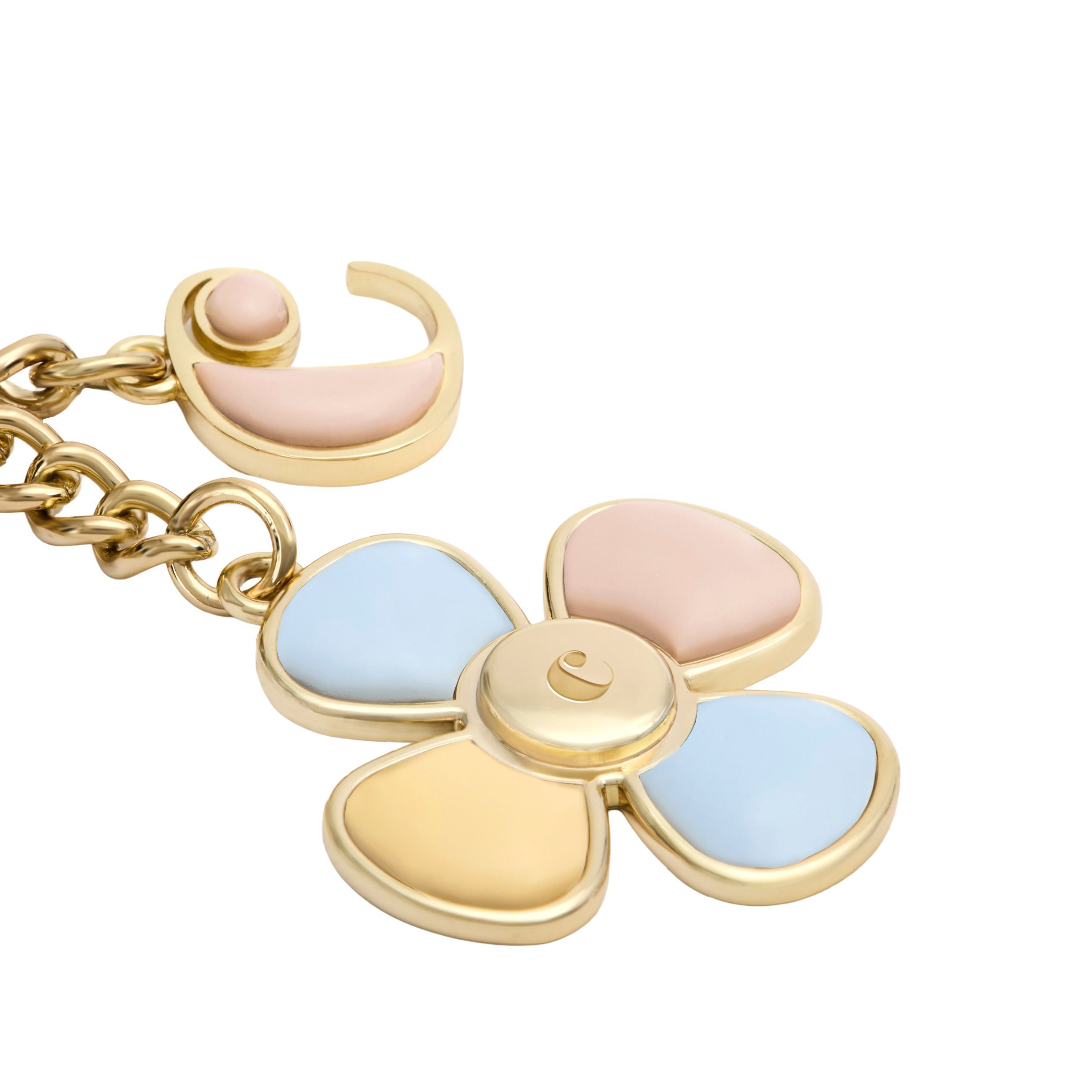 Brelok do kluczy `Vivienne` w tęczowych pastelach i złocie wnosi do kolekcji zabawny, kolorowy akcent. Zawiera uroczą mieszankę elementów, w tym kwiat, kultową literę `C` i delikatnie wygrawerowany okrągły medal `Cacharel`. Dzięki karabińczykowi można go łatwo przymocować do kluczy lub jako stylową ozdobę torby, dodając odrobinę koloru do każdego akcesorium. Wykonany z mosiądzu z wkładkami ABS, ten brelok pięknie uzupełnia torby z kolekcji dzięki żywym pastelowym odcieniom i złotym akcentom.