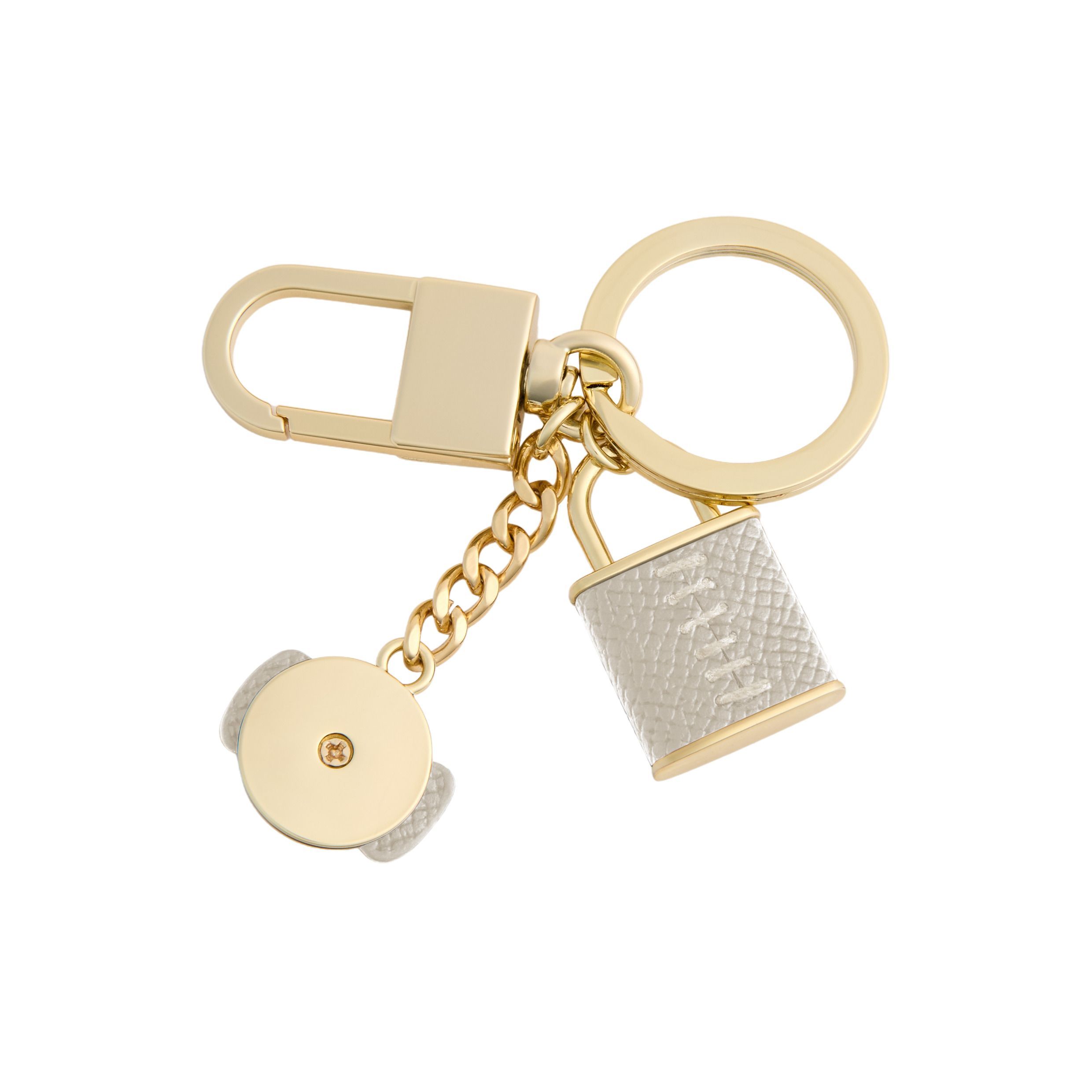 Brelok Seraphine to kobiecy i delikatny dodatek z dwoma zawieszkami: kokardką i kłódką ozdobionymi trójwymiarowym logo Cacharel „C”. Oba elementy łączą wegańską skórę o fakturze saffiano z eleganckimi, pozłacanymi akcentami. Zaprojektowany do noszenia jako brelok do kluczy lub jako ozdoba do torebki. Dostępny w kolorze złotym i czarnym lub złotym i jasnoszarym.