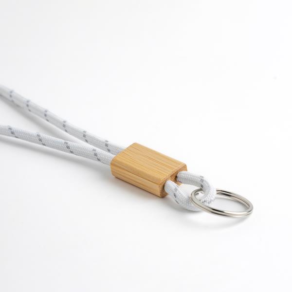 Brelok sznurkowy, regulowany z kółkiem i bambusowym detalem wykonany z poliestru. Dodaj swoje logo, slogan lub unikalny projekt, aby stworzyć wyjątkowy produkt odzwierciedlający tożsamość Twojej marki.