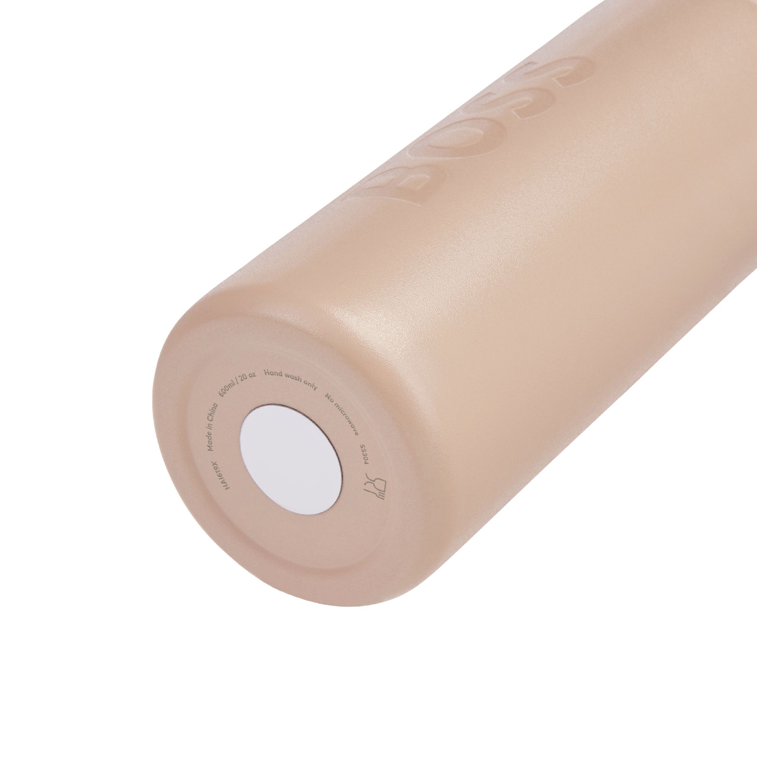 Butelka BOSS charakteryzuje się gładką, matową powierzchnią z wytłoczonym dużym logo BOSS, wyrażającym ciepły i modny charakter poprzez czystą, nowoczesną sylwetkę w kolorze nude z eleganckimi złotymi wykończeniami. Całość dopełnia platerowane logo Double B na pokrywce w pasujących metalowych odcieniach, a starannie dobrane detale i dopasowany tonowo silikonowy pasek zapewniają spójny i opływowy wygląd. Dzięki pojemności 600 ml butelka została zaprojektowana z myślą o codziennym użytkowaniu i łatwym przenoszeniu, umożliwiając noszenie zarówno gorących, jak i zimnych napojów przez cały dzień. Butelka ma podwójne ścianki, wykonane z materiału SS304 wewnątrz i SS201 na zewnątrz.
