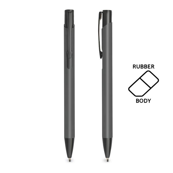 Długopis aluminiowy z gumowaną powierzchnią, z mechanizmem wciskanym, pisze na niebiesko.