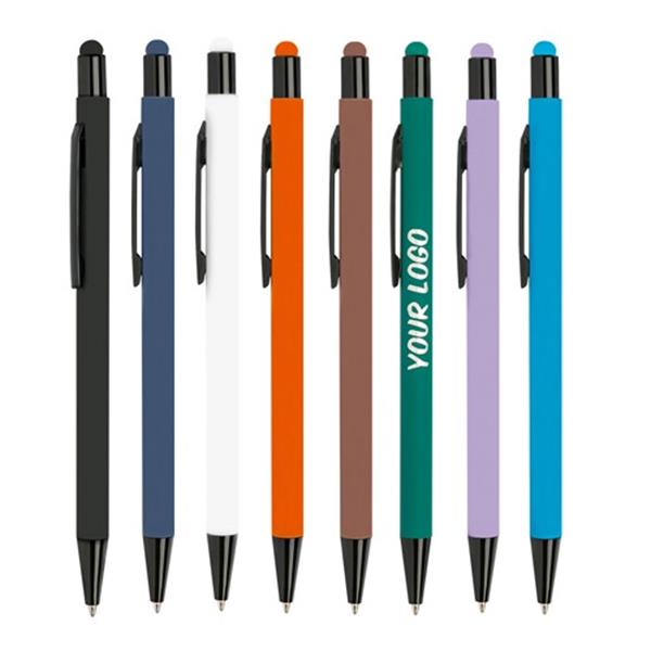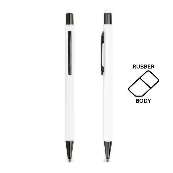 Długopis aluminiowy z gumką do obsługi ekranów dotykowych i gumowaną powierzchnią, z mechanizmem wciskanym, pisze na niebiesko.