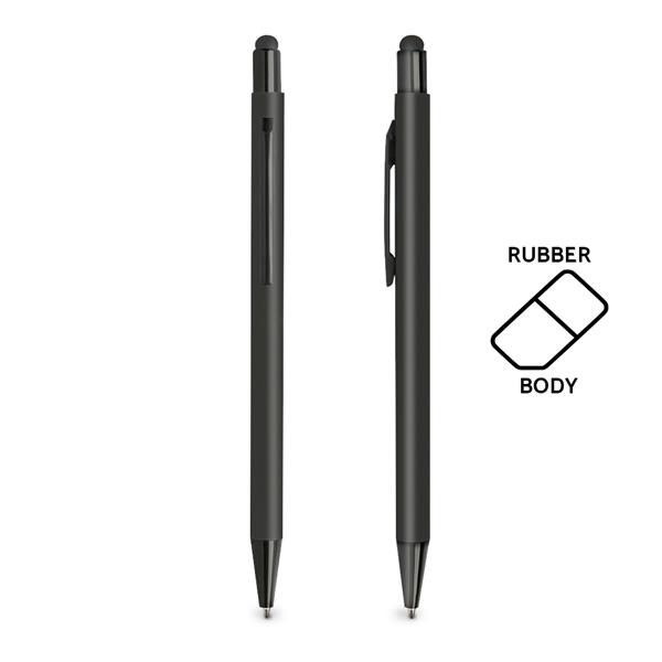 Długopis aluminiowy z gumką do obsługi ekranów dotykowych i gumowaną powierzchnią, z mechanizmem wciskanym, pisze na niebiesko.