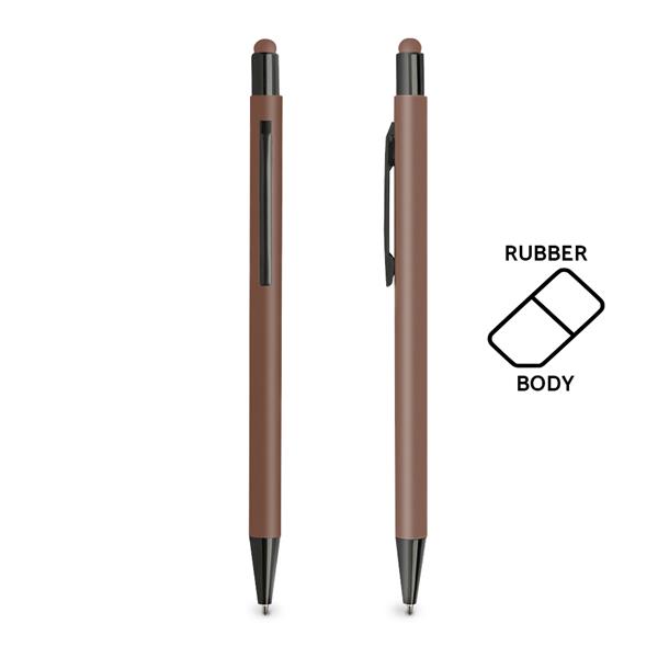 Długopis aluminiowy z gumką do obsługi ekranów dotykowych i gumowaną powierzchnią, z mechanizmem wciskanym, pisze na niebiesko.