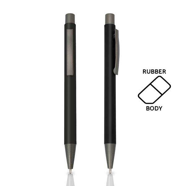Długopis posiada aluminiowe elementy obraz korpus, pokryty gumową powłoką. Długopis posiada wkład `Parker` piszący na niebiesko.