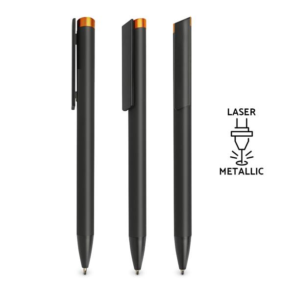 Czarny długopis z mechanizmem wciskanym z gumową, antypoślizgową powłoką, soft touch i kolorową końcówką. Długopis posiada wkład piszący na niebiesko. Grawer wychodzi w kolorze końcówki.