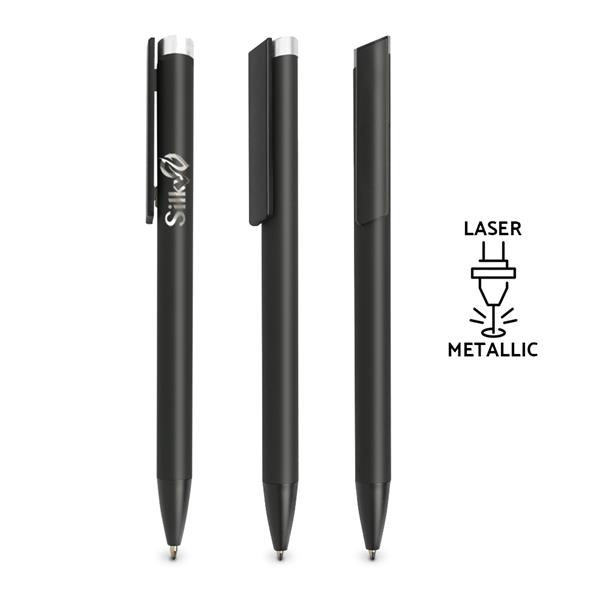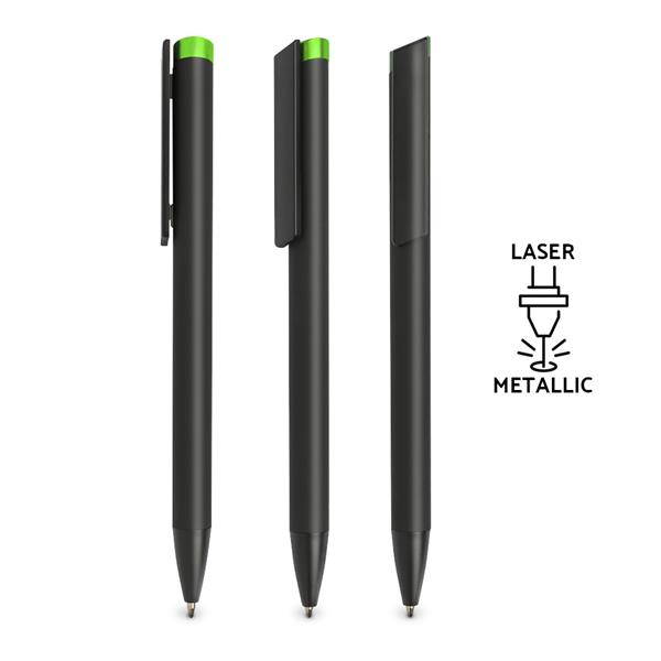 Czarny długopis z mechanizmem wciskanym z gumową, antypoślizgową powłoką, soft touch i kolorową końcówką. Długopis posiada wkład piszący na niebiesko. Grawer wychodzi w kolorze końcówki.