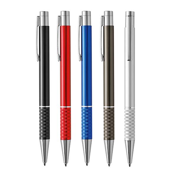 Metalowy długopis z elementami w srebrnym kolorze, z mechanizmem wciskanym, pisze na czarno.