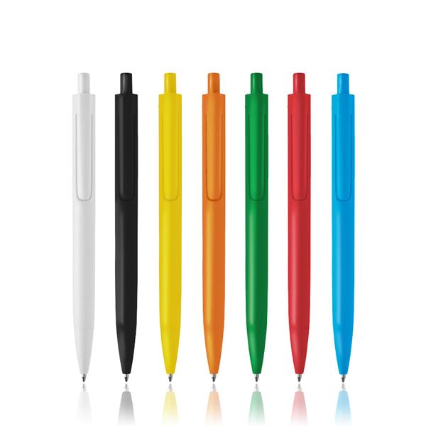 Długopis plastikowy w jednolitym kolorze, z mechanizmem wciskanym, pisze na niebiesko.