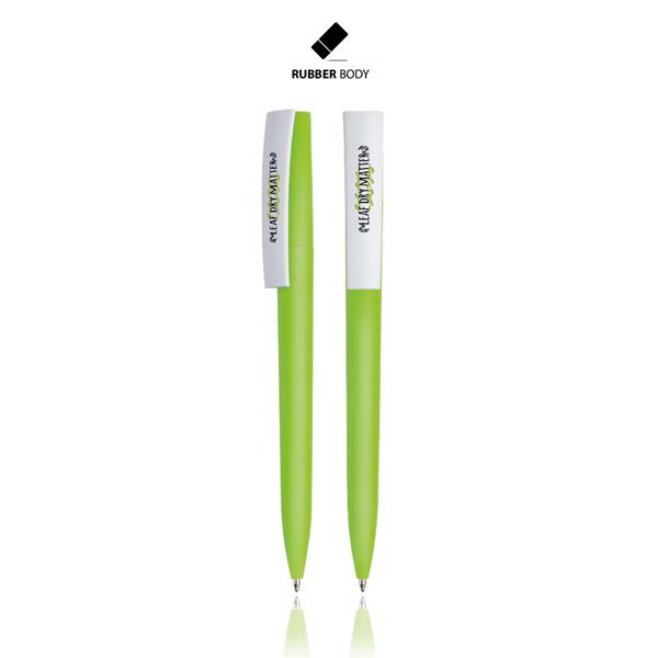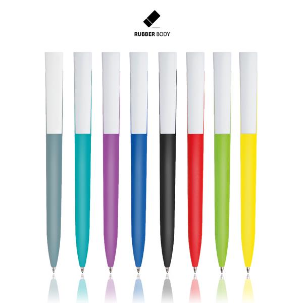Długopis plastikowy z gumowaną powłoką soft touch, mechanizmem obrotowym oraz dużym klipiem. Pisze na czarno.