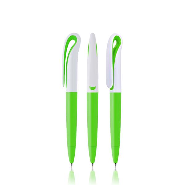 Długopis plastikowy z wygiętym klipsem i mechanizmem obrotowym, pisze na czarno.