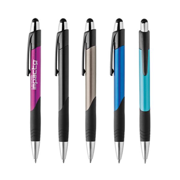 Długopis plastikowy z gumką do obsługi ekranów dotykowych, z mechanizmem wciskanym, pisze na niebiesko.