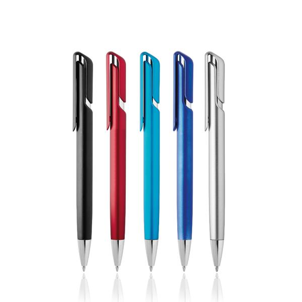 Długopis plastikowy w metalicznym kolorze, z mechanizmem wciskanym, pisze na niebiesko.