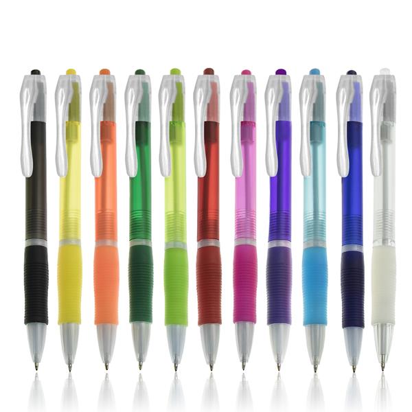 Długopis plastikowy z ergonomicznym uchwytem i z mechanizmem wciskanym, pisze na czarno.