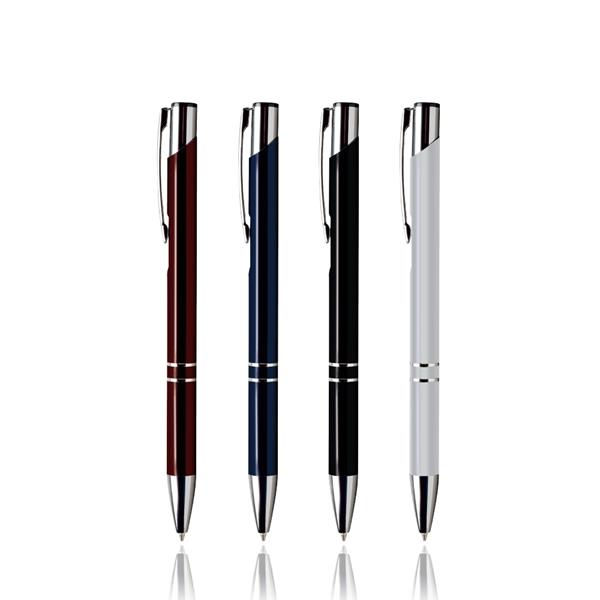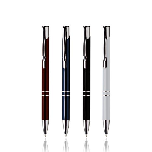 Długopis plastikowy z metalowym klipsem i mechanizmem wciskanym, pisze na czarno.
