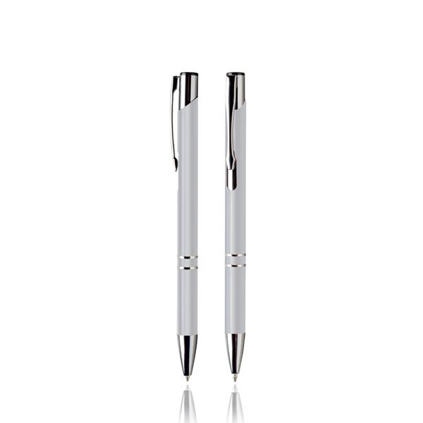 Długopis plastikowy z metalowym klipsem i mechanizmem wciskanym, pisze na czarno.