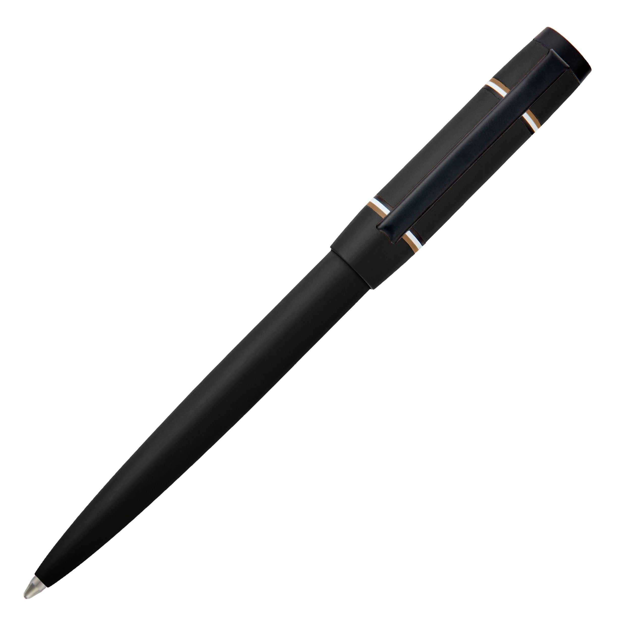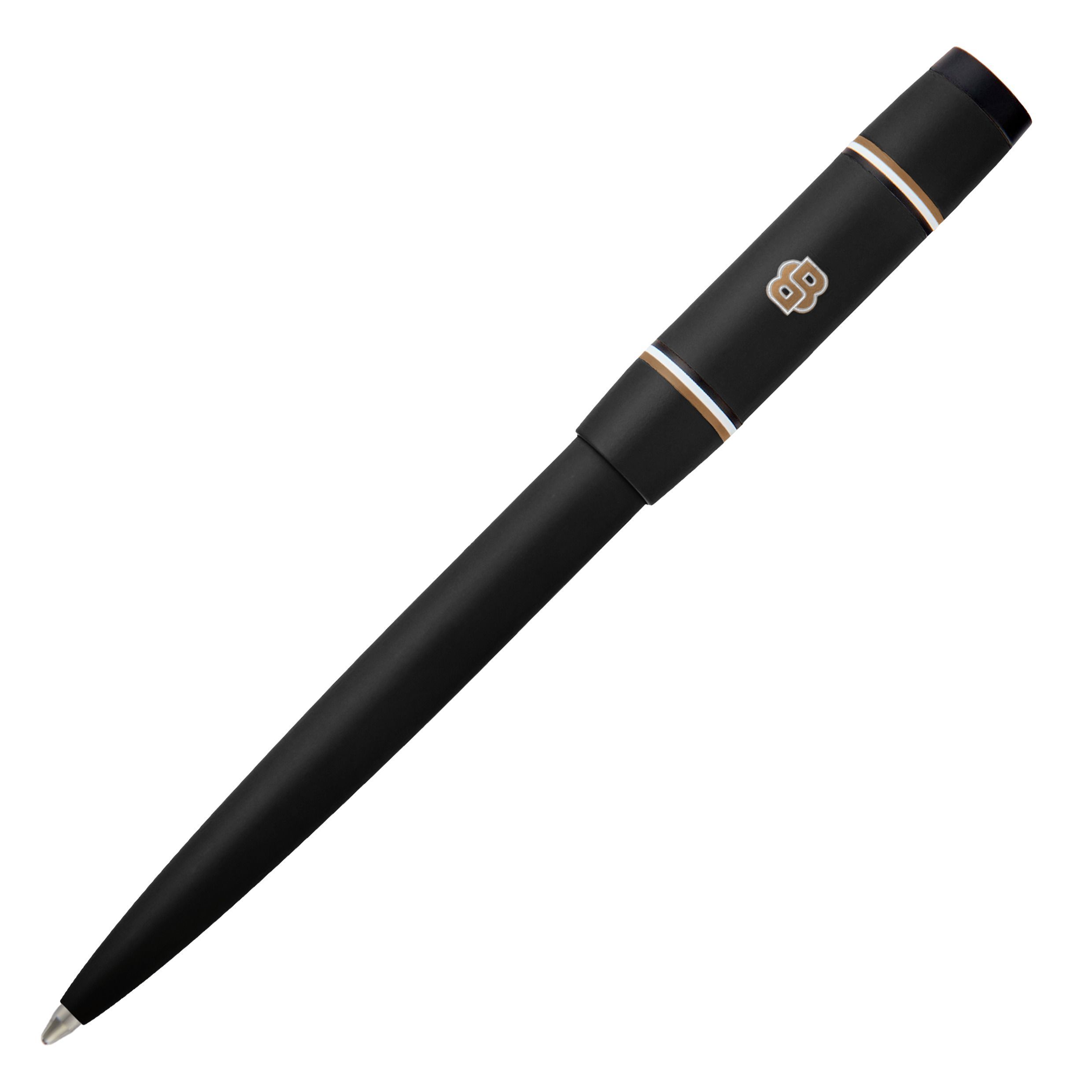 Długopis uniwersytecki Rive wprowadza świeży, pełen energii akcent do słynnej sylwetki Rive, nadając jej kolorową, graficzną i radosną energię. Nadrukowane logo Double B z wyraźnym, białym konturem tworzy centralny motyw, obramowany dwoma ultracienkimi, lustrzanymi, kultowymi paskami. Matowe, czarne wykończenia podkreślają nowoczesny, graficzny charakter, a grawerowane logo HUGO BOSS u góry dodaje elegancji. Dostępny w kolorze czarnym, karmelowym, granatowym, bordowym i ciemnozielonym, oferuje żywe spojrzenie na współczesny styl.
