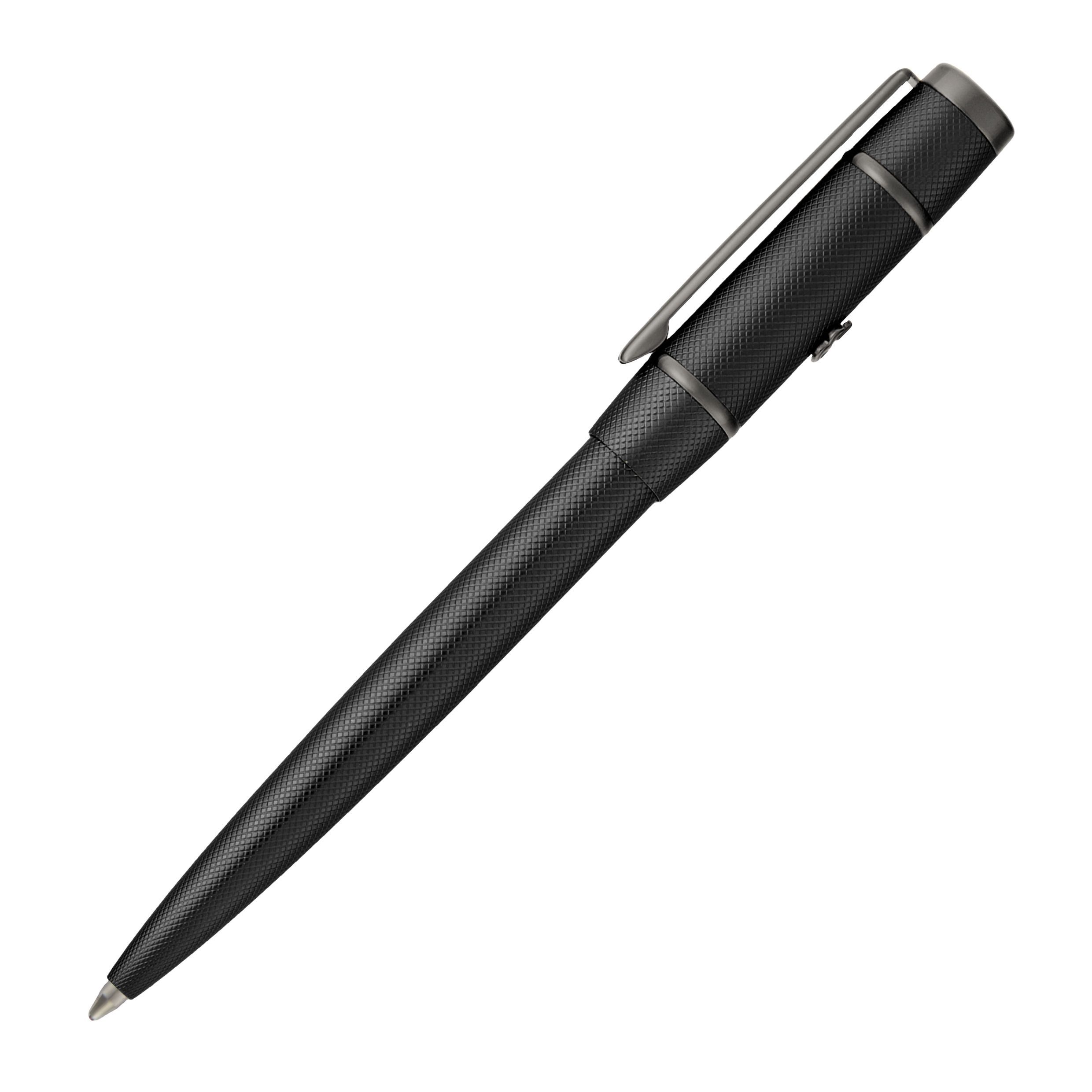 Długopis Rive wyraża nowoczesny, graficzny język projektowania, który eksponuje nowe logo Double B poprzez kontrolowane kontrasty metalowych wykończeń. Jego ciasno szlifowana powierzchnia o diamentowym szlifie kontrastuje z gładkimi, czarnymi i grafitowymi wykończeniami, logo i akcentami, tworząc wyrazistą, architektoniczną prezencję. Trójwymiarowe logo Double B dodaje głębi i precyzji, a logo HUGO BOSS na górze nadaje produktowi wyrafinowany, współczesny charakter.