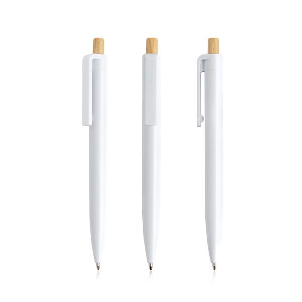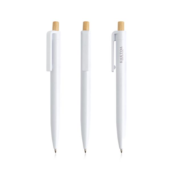 Długopis z recyklingowanego ABS z bambusowym detalem. Recyklingowany długopis o unikalnym kolorze i bambusowym przyciskiem. Z mechanizmem wciskanym i piszący na niebiesko, jest doskonałym wyborem na prezent, który promuje markę i wspiera ochronę środowiska.
