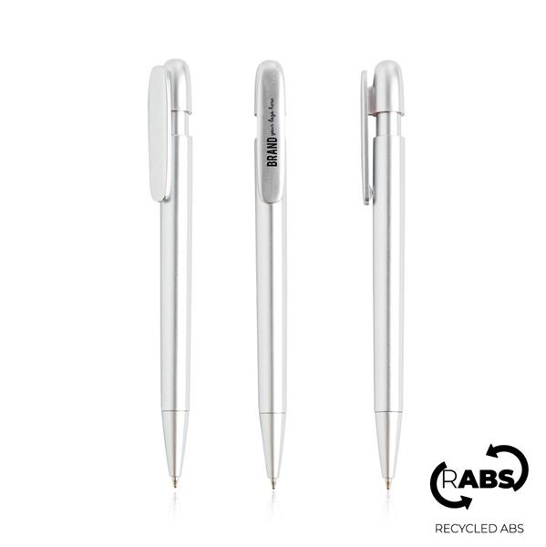 Długopis z recyklingowanego ABS. Wciskany długopis wykonany z plastiku pochodzącego z recyklingu, z szerokim klipsem. Ten długopis piszący na niebiesko to idealny wybór na praktyczny i ekologiczny prezent!