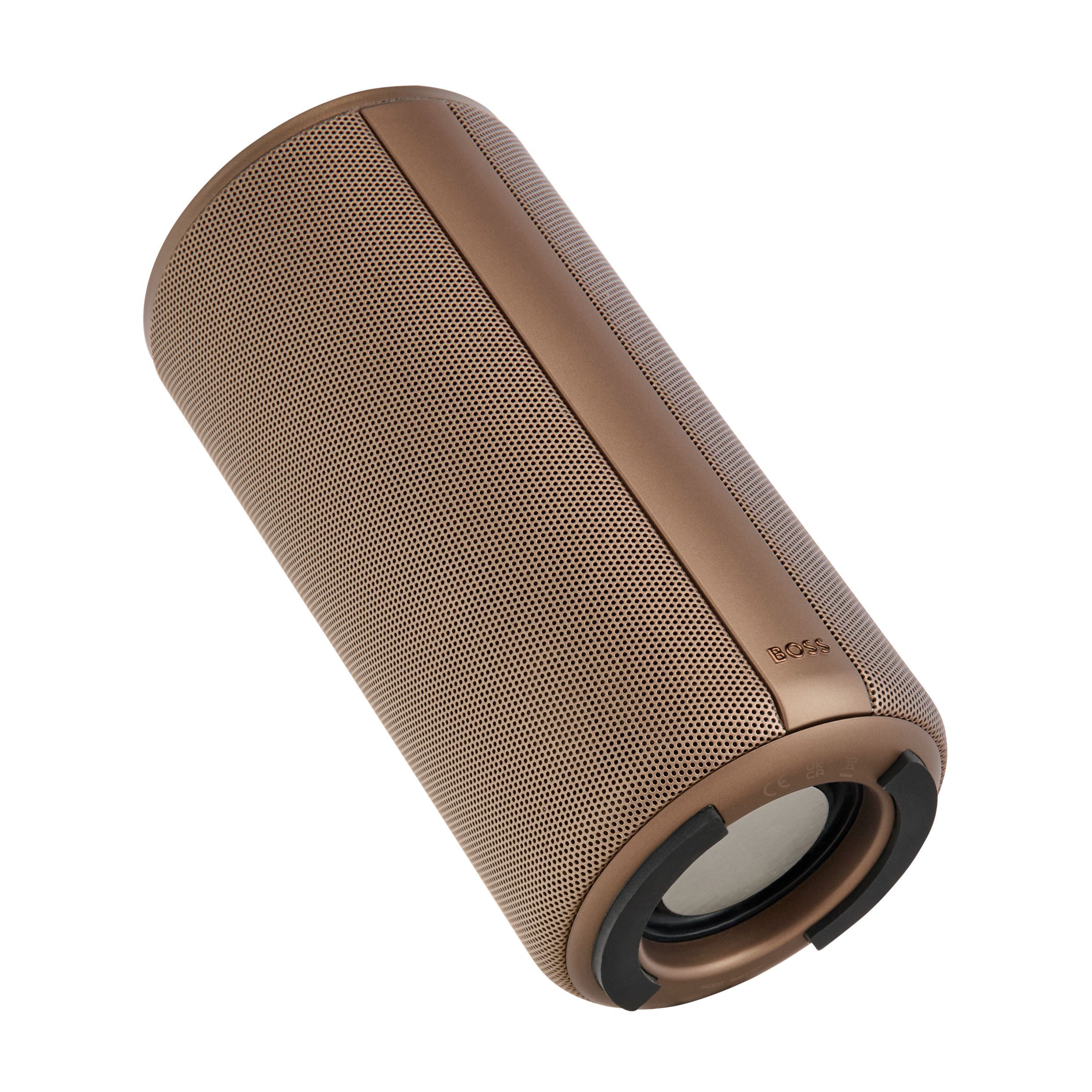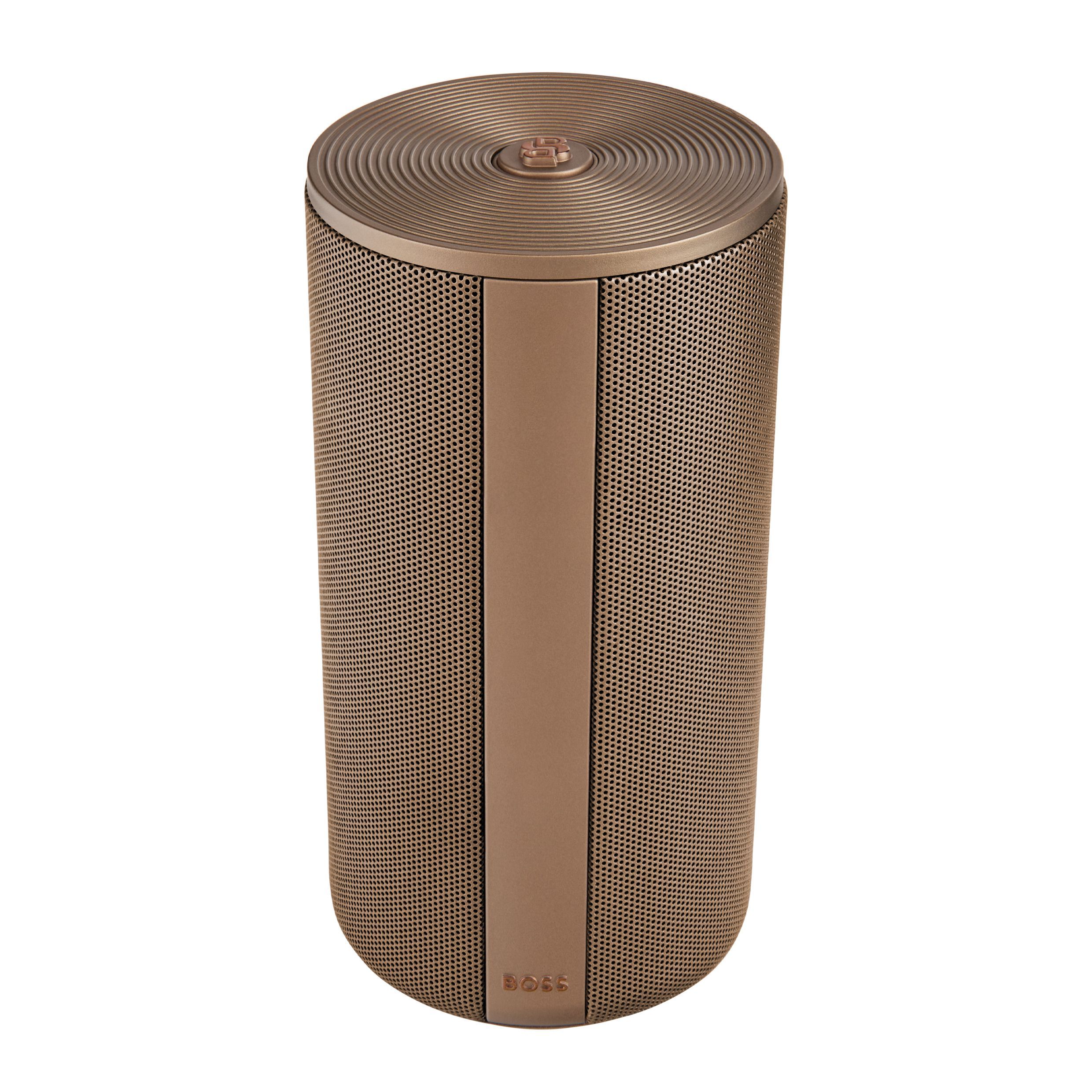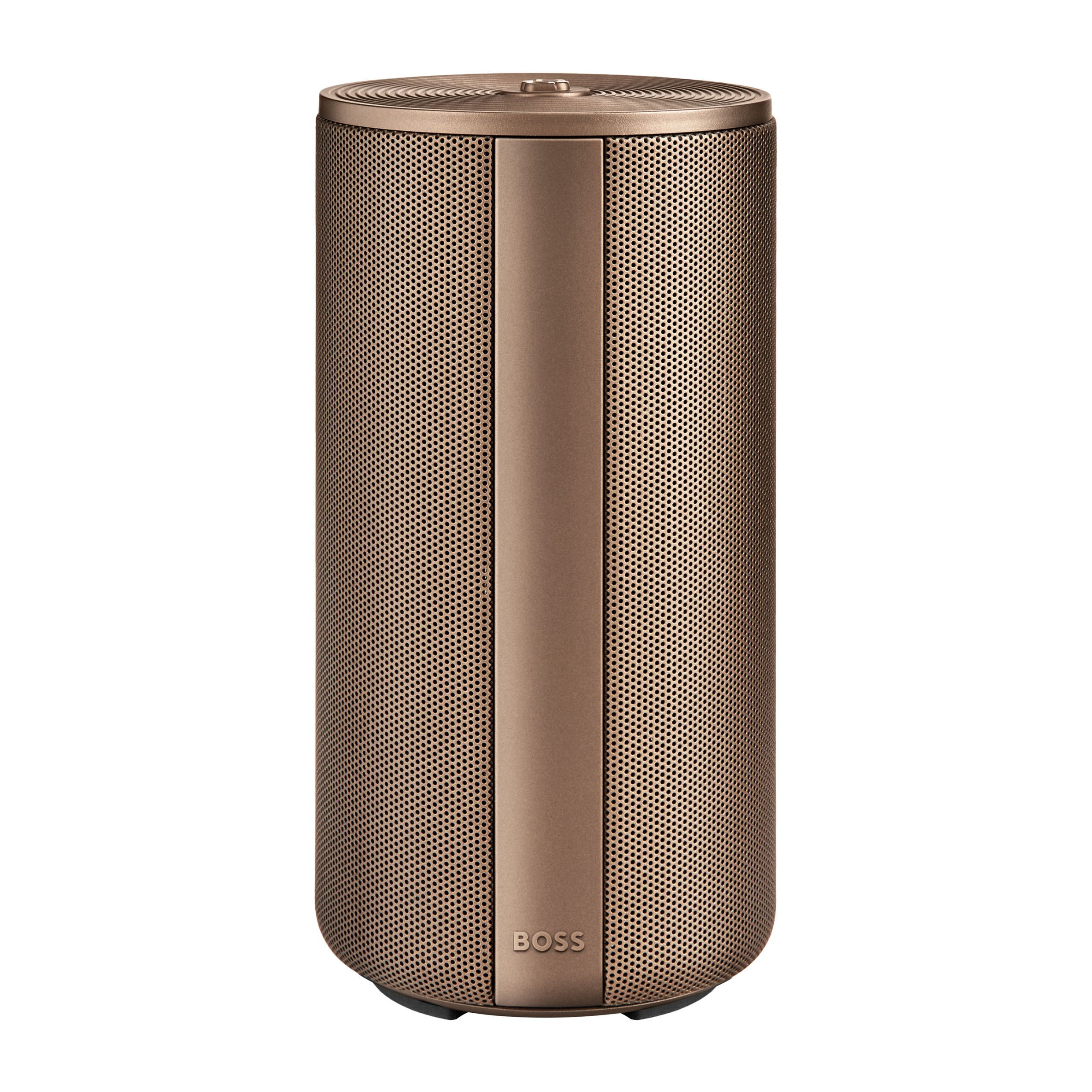 Duży głośnik Elemental łączy w sobie mobilność z wyrafinowaną, architektoniczną prezencją, podkreśloną metalizowanym wykończeniem i czystymi, pionowymi detalami. Logo Double B wieńczy główny przycisk sterujący, a subtelny podpis BOSS stanowi podstawę projektu. Głośnik o mocy 20 W (2×10 W) oferuje 10 godzin pracy na baterii i wygodne ładowanie przez USB-C. Dostępny w kolorze czarnym, srebrnym i metalizowanym kolorze camelowym.