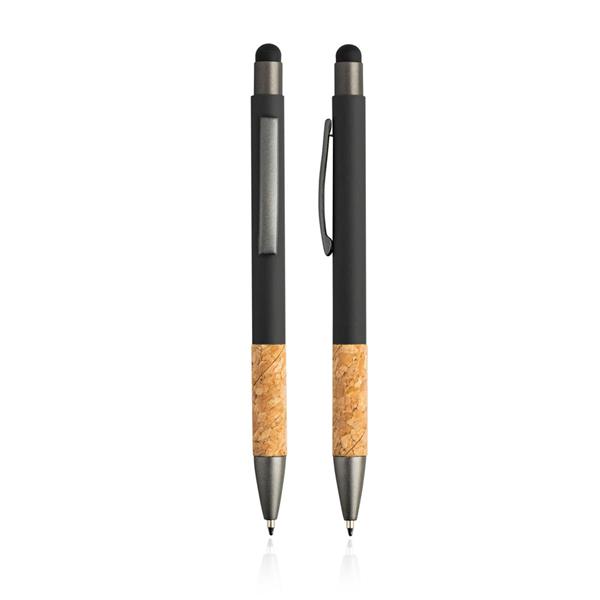 Długopis wykonany z aluminium oraz korka, posiada gumowane wykończenie bardzo przyjemne w dotyku. Dzięki eleganckiemy połączeniu materiałów idealnie nadaje się do grawerowania laserowego. Posiada funkcję touch, pisze na niebiesko.