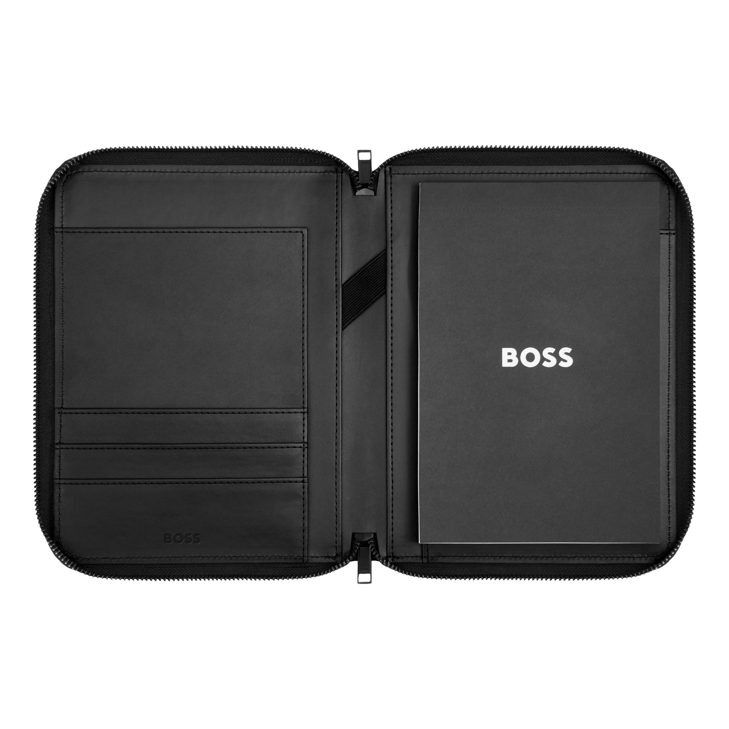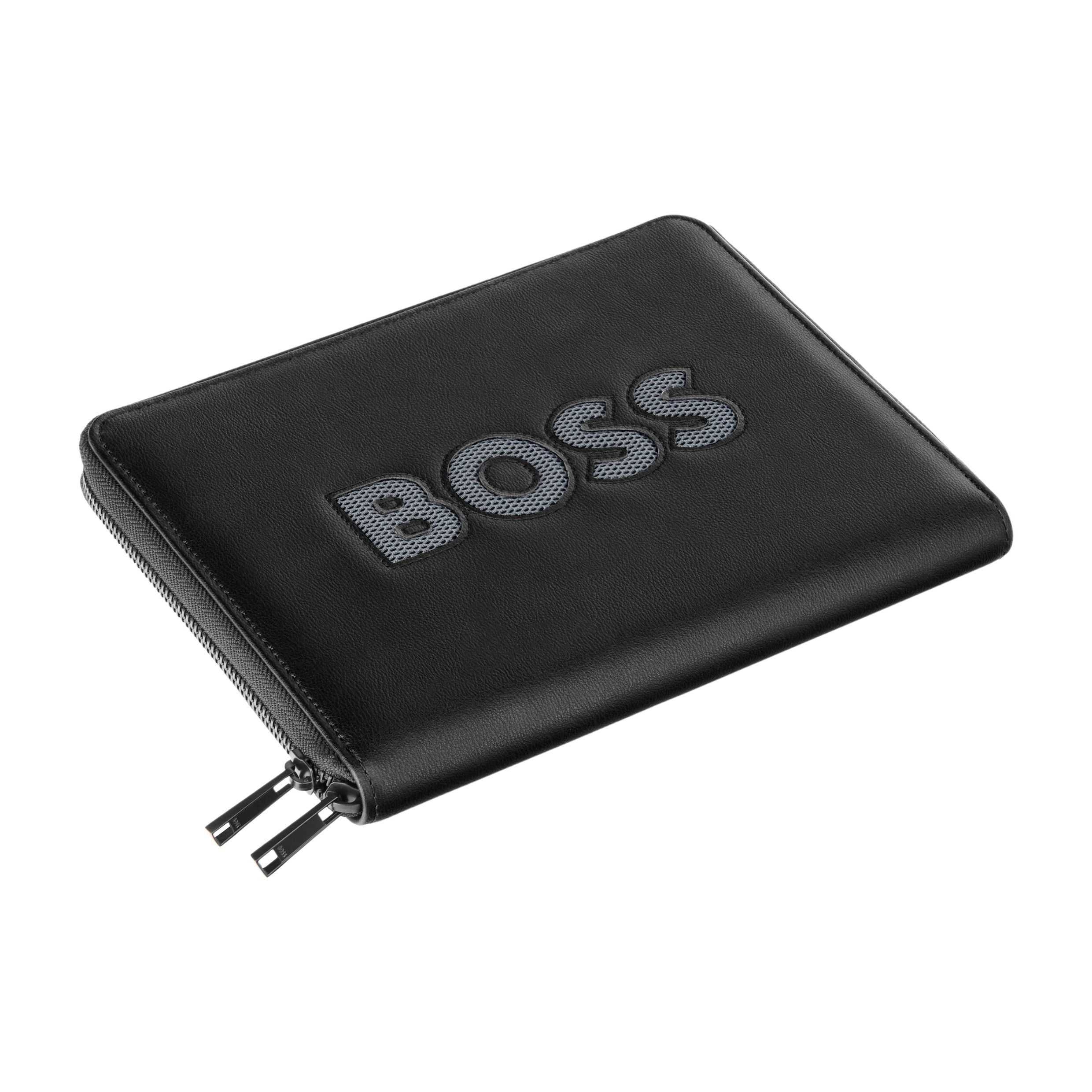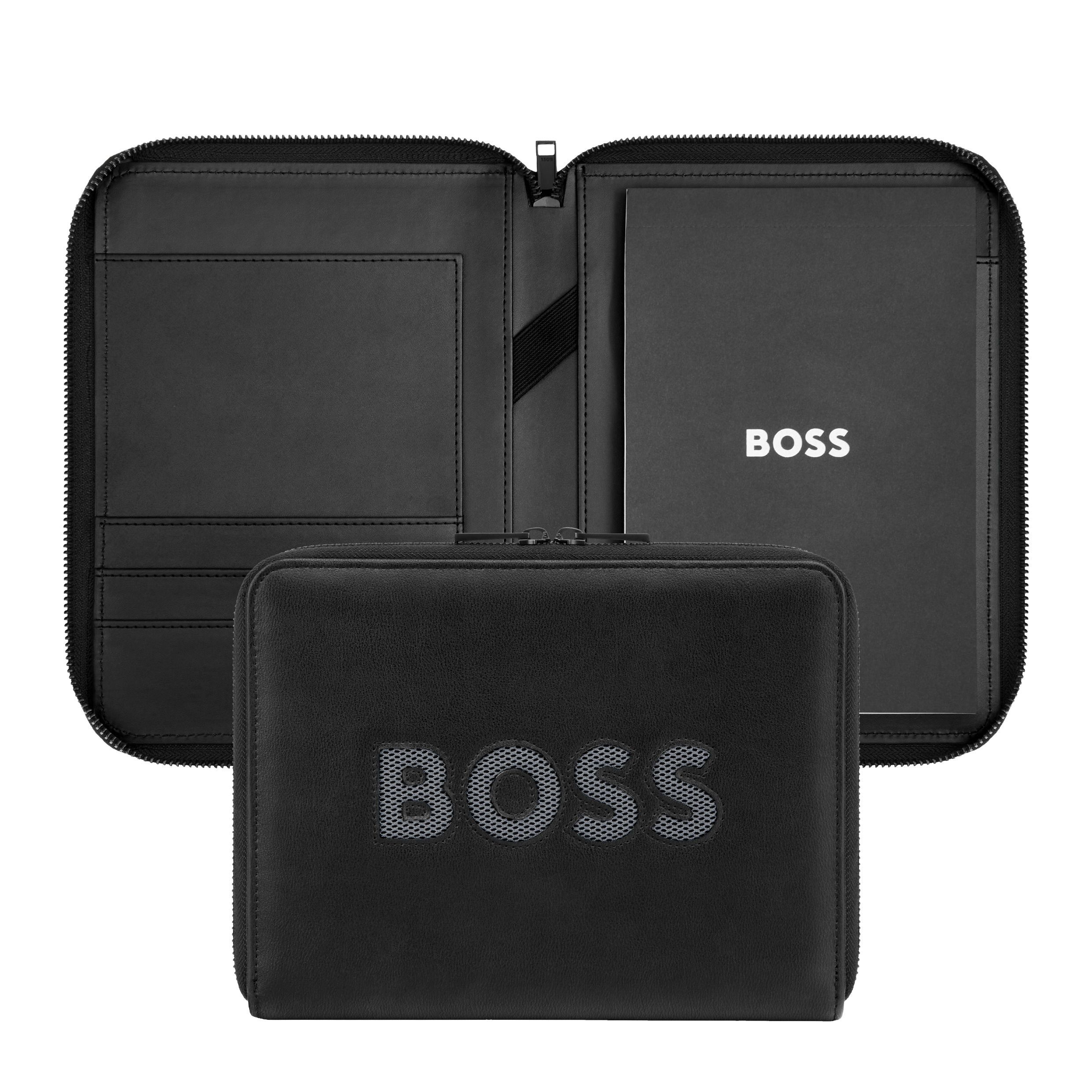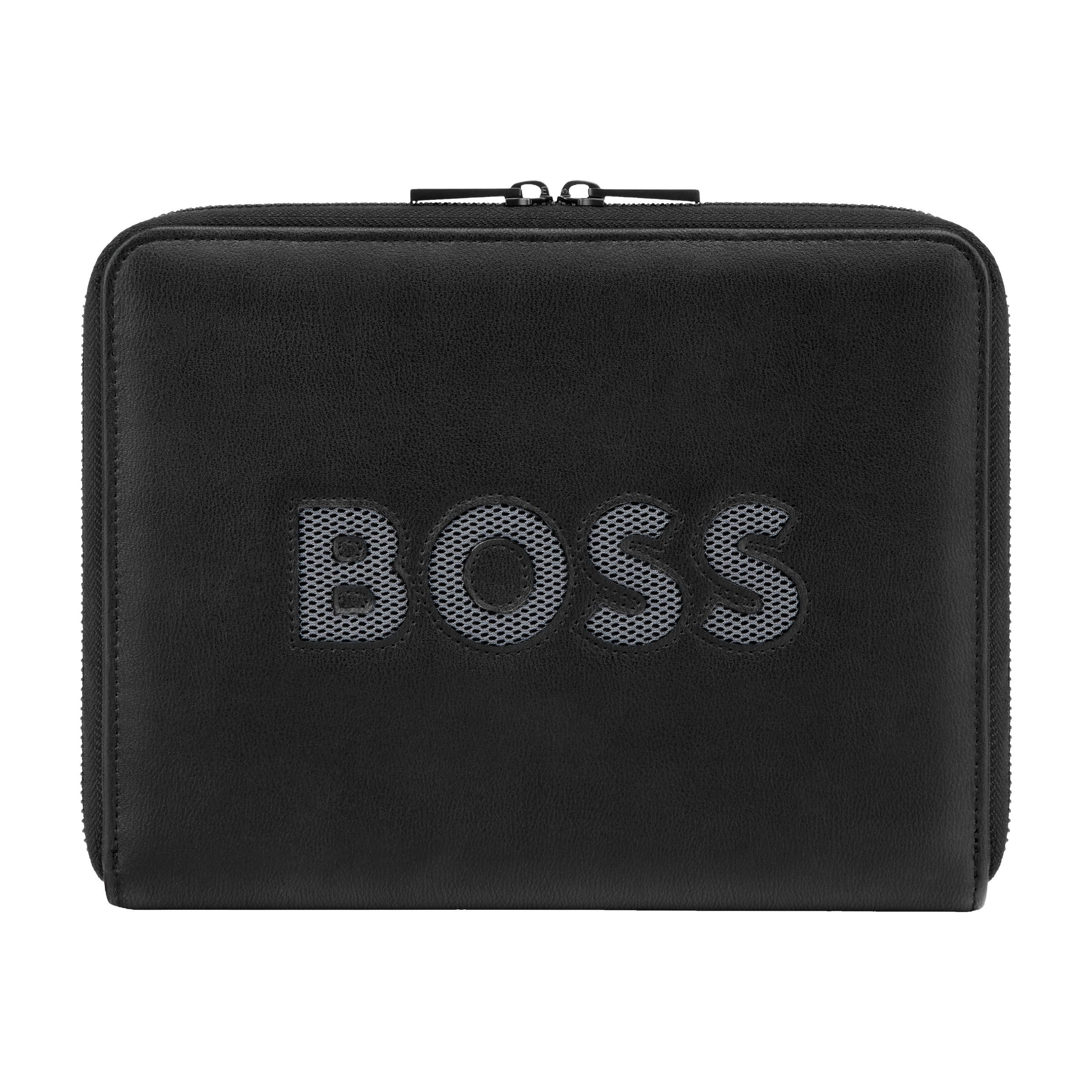 Ten folder A5 prezentuje śmiałe, a zarazem dyskretne, graficzne wycięte logo BOSS, nałożone na kontrastową siateczkę, nadając mu charakterystyczny, aktywny wygląd. Gładka, czarna powłoka poliuretanowa kontrastuje z szarą siateczką nylonową, tworząc subtelny dialog między eleganckimi powierzchniami a techniczną fakturą. Duże logo podkreśla całość, zachowując jednocześnie minimalistyczny, współczesny balans. Wykończony ekskluzywnym, nowym suwakiem BOSS i matowoczarnymi wykończeniami, model ten emanuje nowoczesnym, aktywnym duchem z wyrafinowaną nutą.