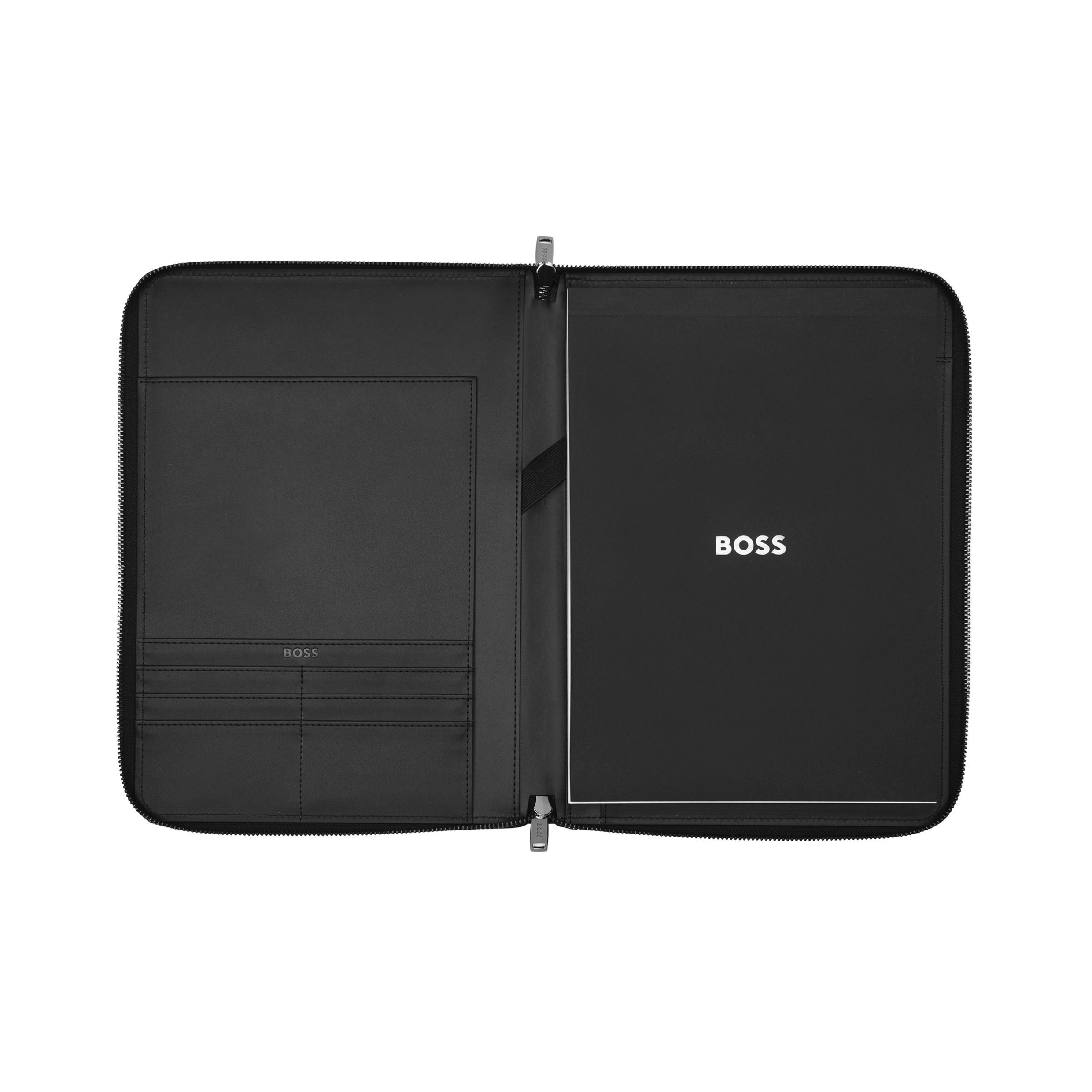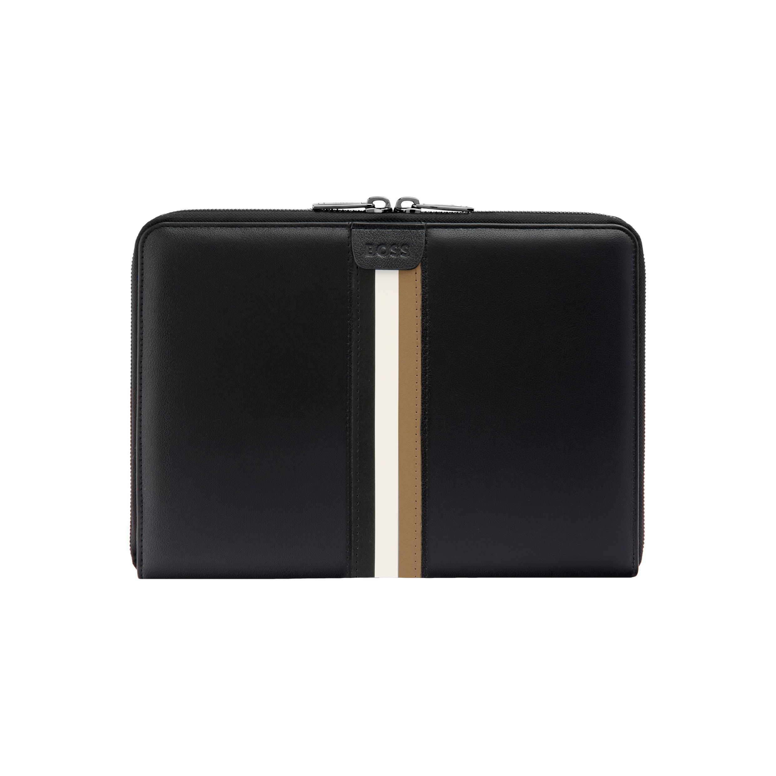 Teczka A5 od BOSS łączy w sobie inspirowany aktywnością design z luksusowym podejściem. Wykonany z gładkiego, miękkiego czarnego PU, posiada nadrukowany 3-kolorowy ikoniczny pasek na środku. Logo BOSS jest wytłoczone na przywieszce zdobiącej pasek, a teczka jest wykończona metalowymi zamkami błyskawicznymi z wygrawerowanym logo BOSS. Idealna dla entuzjastów marki, ta teczka łączy styl z praktycznością do codziennego użytku.