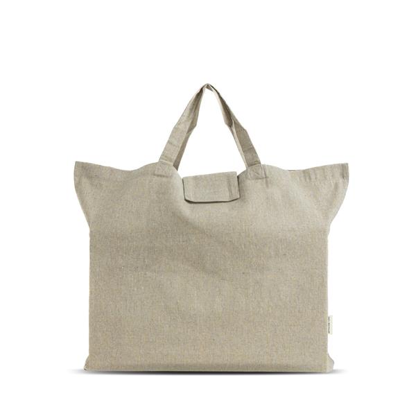 Składana torba z melange’owej bawełny z recyklingu o gramaturze 150 g/m². Wykonana w 100% z bawełny z recyklingu, pozyskiwanej ze ścinków poprodukcyjnych (pre-consumer). Podczas produkcji odzieży niewielkie resztki tkanin są ponownie wykorzystywane do stworzenia nowego, trwałego materiału o naturalnie jasnym odcieniu. Konstrukcja z pełnym dnem i bokami zwiększa pojemność oraz funkcjonalność torby, dzięki czemu świetnie sprawdzi się na codzienne zakupy, eventy czy jako ekologiczny nośnik promocyjny. To przyjazny środowisku wybór, który łączy praktyczność, wytrzymałość i odpowiedzialność ekologiczną.
