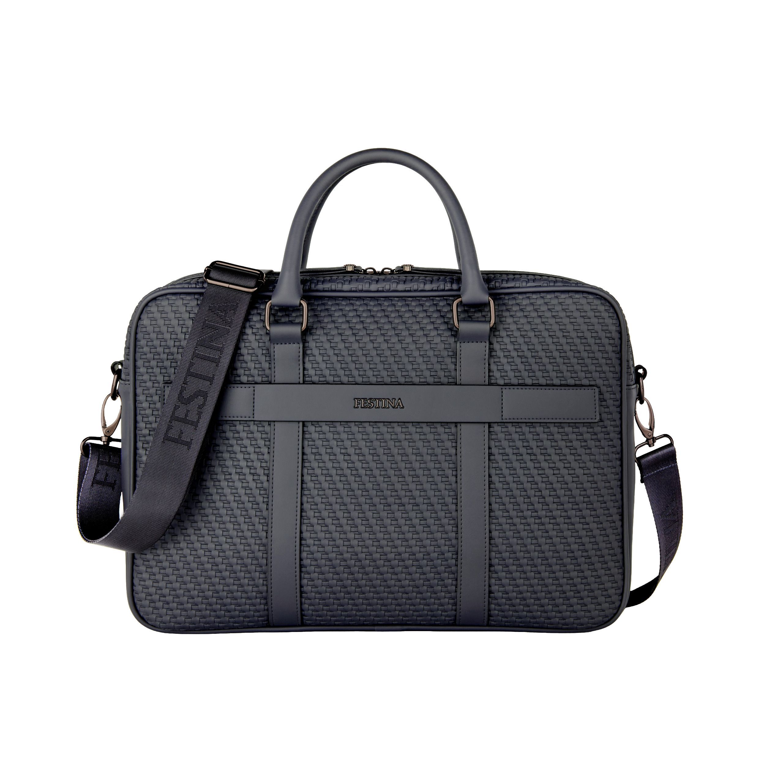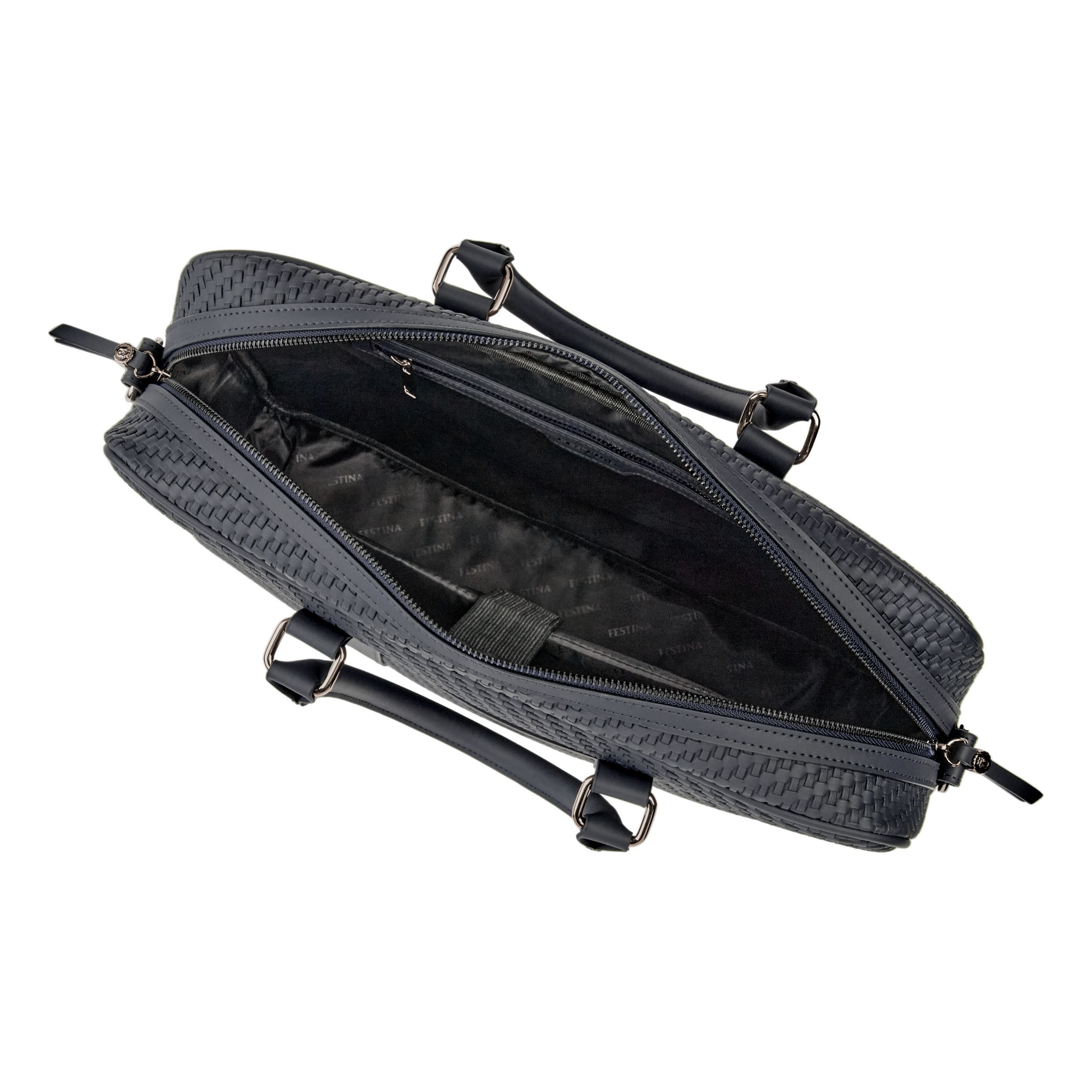 Granatowa torba na dokumenty Interlace łączy inspirowaną tkaną fakturę linii z klasyczną, ponadczasową sylwetką. Wykonana na wzór misternego splotu i wykończona gładkim matem, oferuje luksusowy, nowoczesny charakter, wzbogacony o sygnowane detale, w tym suwaki z wygrawerowanym herbem. Wnętrze jest idealnie zorganizowane, z dedykowaną przegrodą na laptopa, wewnętrzną kieszenią zapinaną na zamek oraz podszewką z monogramem, która podkreśla wyrafinowane wykończenie. Chowany, regulowany pasek z logo zapewnia wygodę i praktyczność na co dzień. Uzupełniony eleganckimi akcentami z motywem broni, projekt pozostaje zdecydowanie szykowny, koncentrując się na bogatej fakturze i nowoczesnej elegancji.