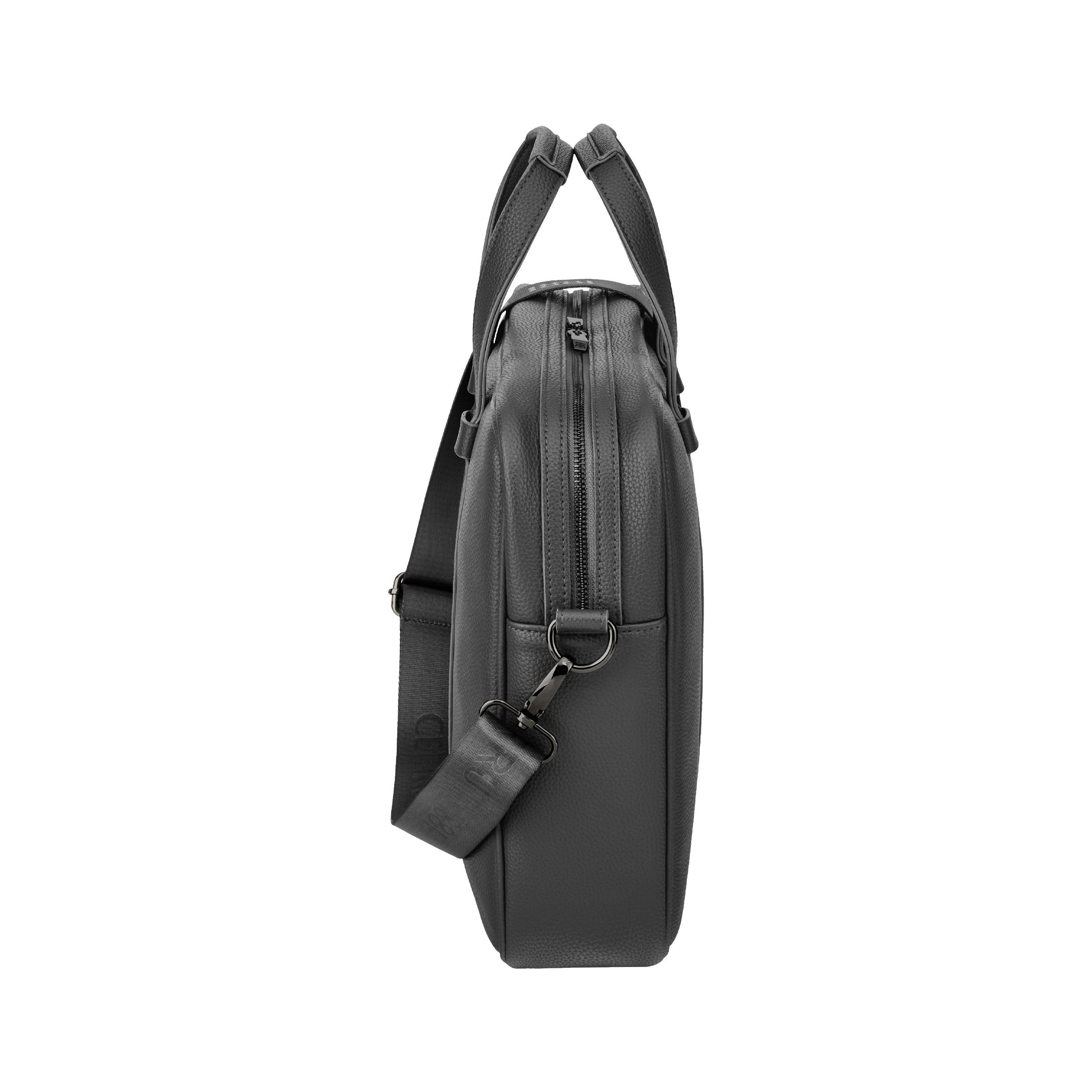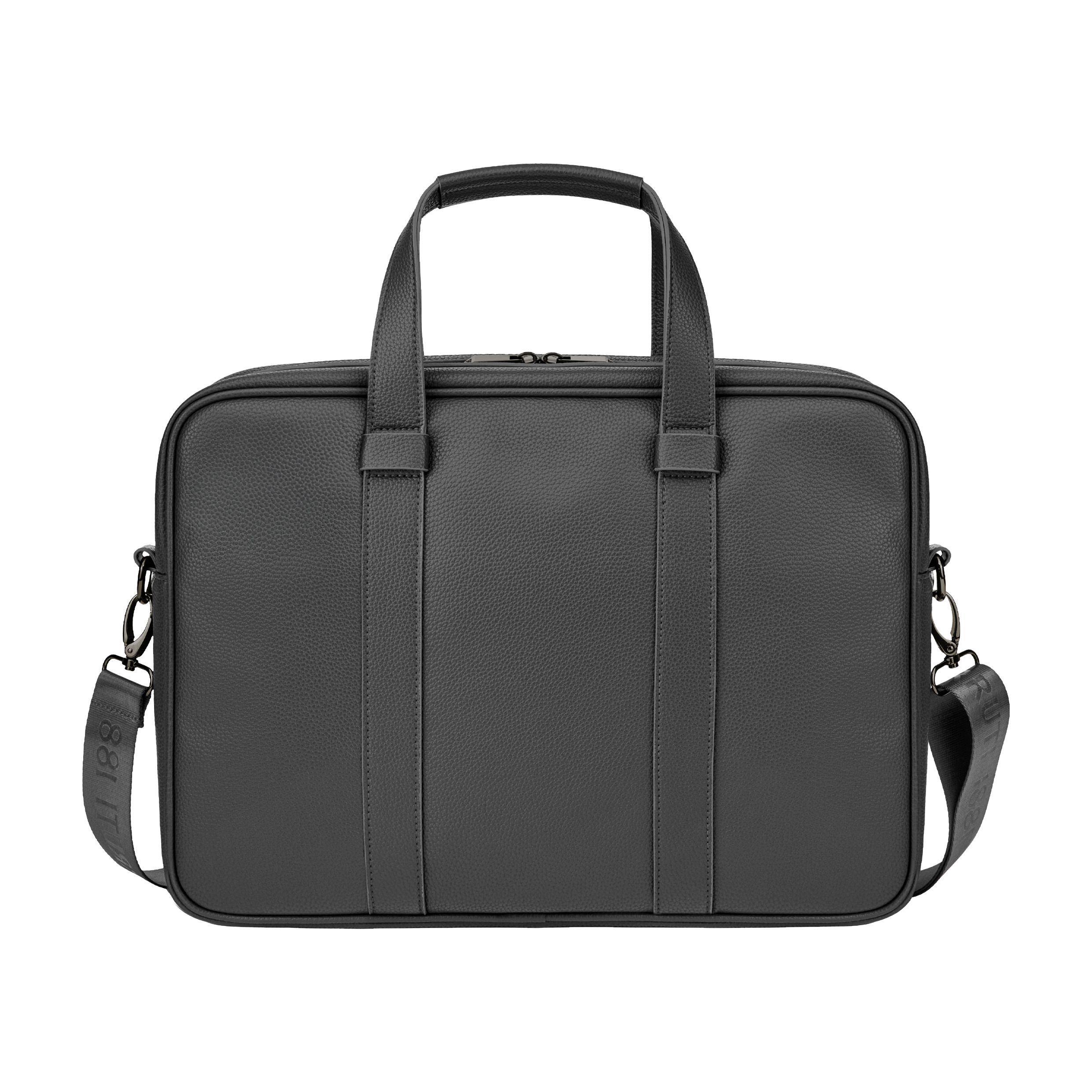 Ciemnoszara torba na dokumenty Jefferson z metalowymi wykończeniami wyraża dyskretną elegancję i czysty minimalistyczny styl. Jej ponadczasowy, minimalistyczny kształt dopełnia wszechstronna funkcjonalność: dedykowana przegroda na laptopa, wewnętrzna kieszeń zapinana na zamek oraz podszewka z monogramem, która zapewnia idealną organizację w pracy lub w podróży. Wyrafinowana, matowa faktura o subtelnej fakturze zapewnia subtelną w dotyku fakturę, wzmocnioną luksusowymi akcentami w metalicznym kolorze, w tym nową płytką Cerruti 1881 i kanciastymi suwakami RR, które wzbogacają design o dyskretną elegancję. Chowany i regulowany pasek parciany z logo podkreśla ten perfekcyjnie wykonany, klasyczny i minimalistyczny towarzysz.