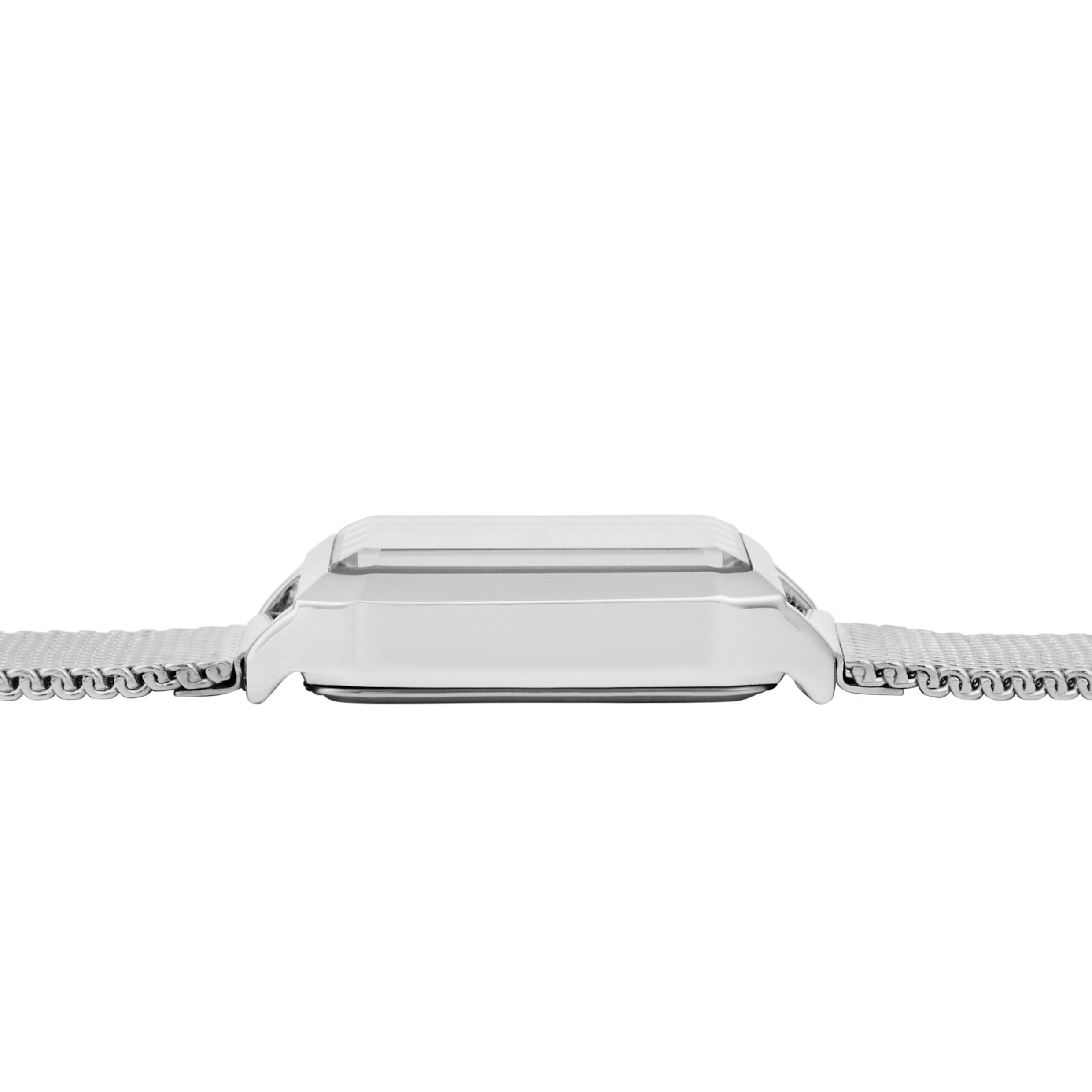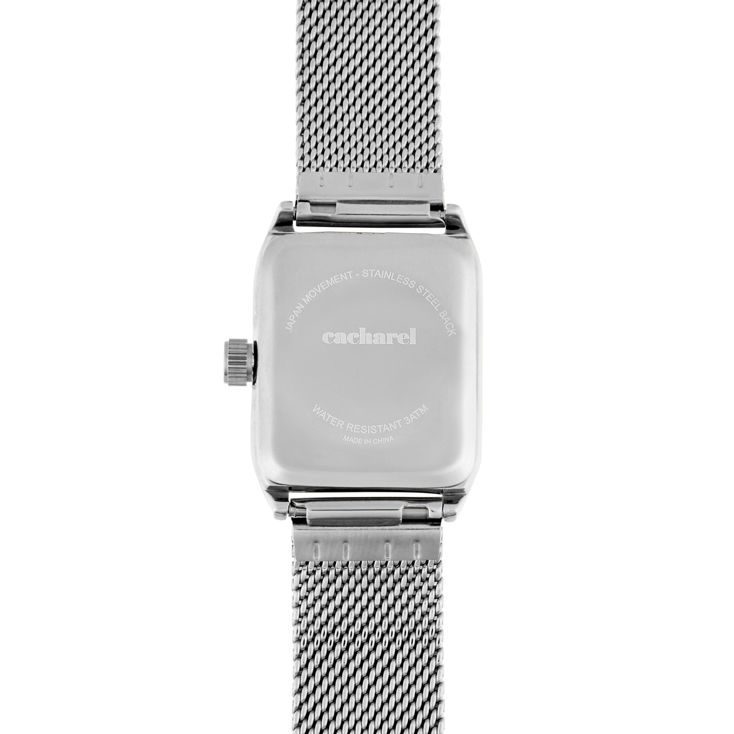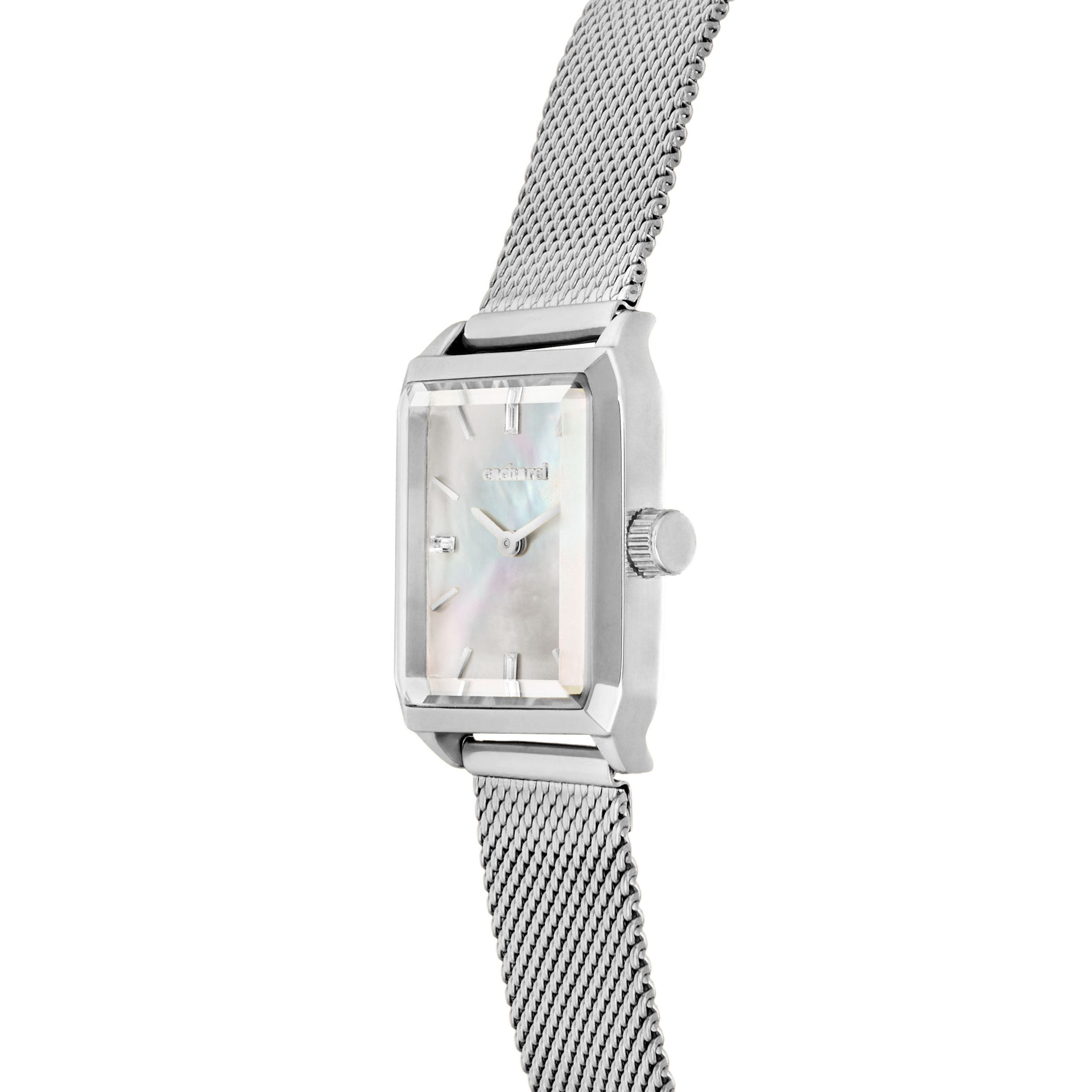 Zegarek Philomène w kolorze srebrnym wyróżnia się elegancką bransoletą z siatki mediolańskiej w połączeniu z elegancką srebrną kopertą, tworząc smukłą i ponadczasową sylwetkę. Tarcza z masy perłowej jest w całości wykończona srebrem, a pojedynczy kamień dodaje subtelnego blasku. Idealnie proporcjonalna, kanciasta koperta nadaje mu elegancki i ponadczasowy styl.