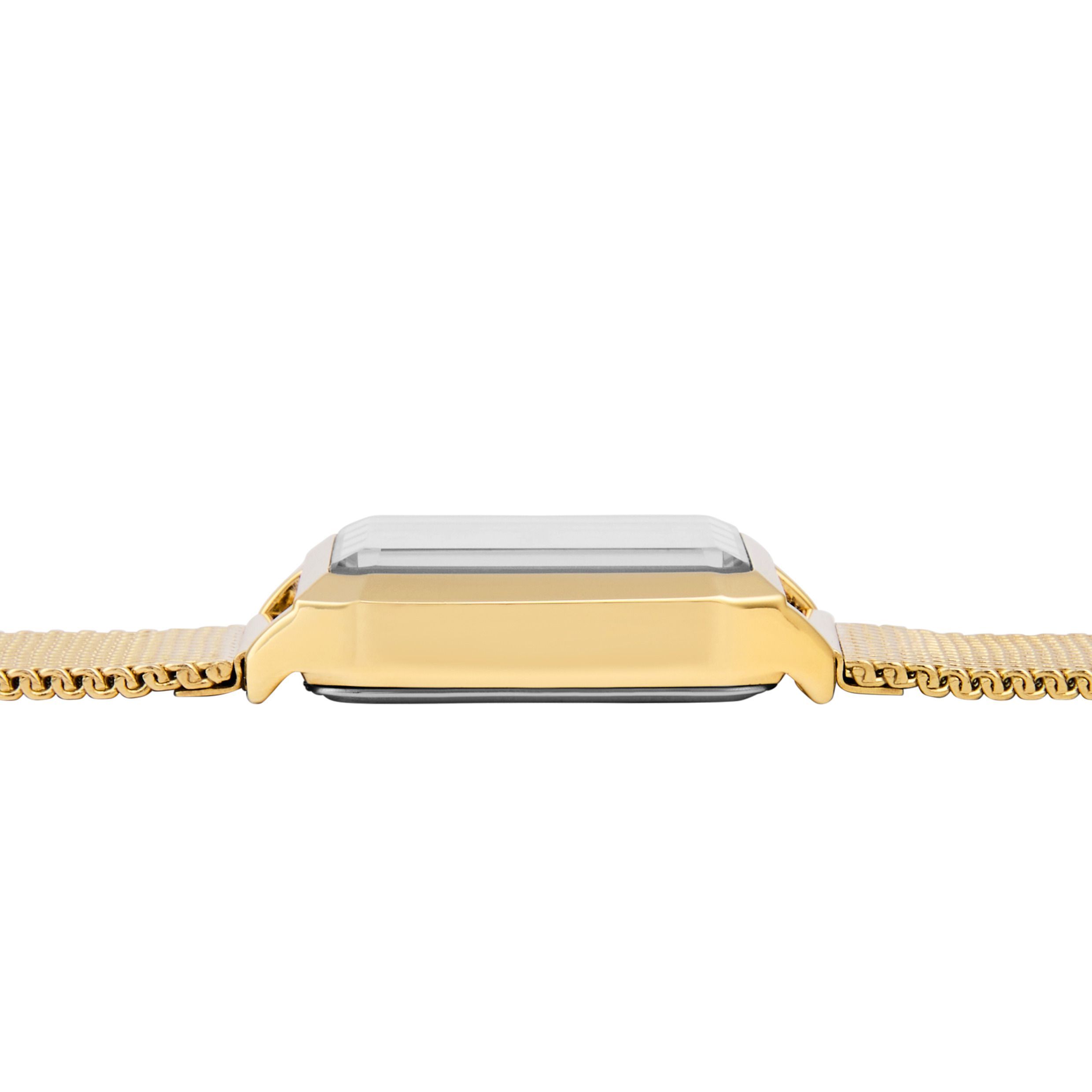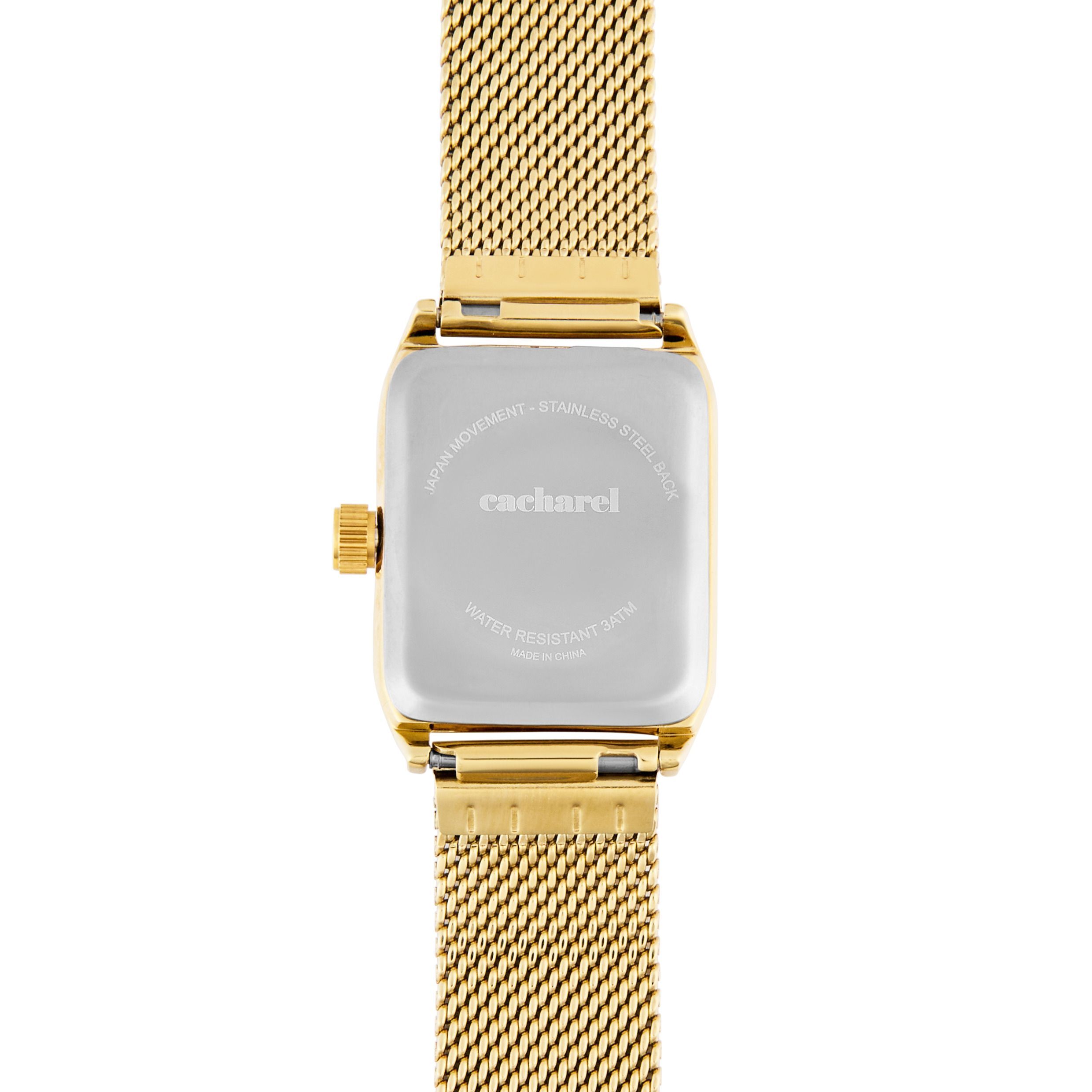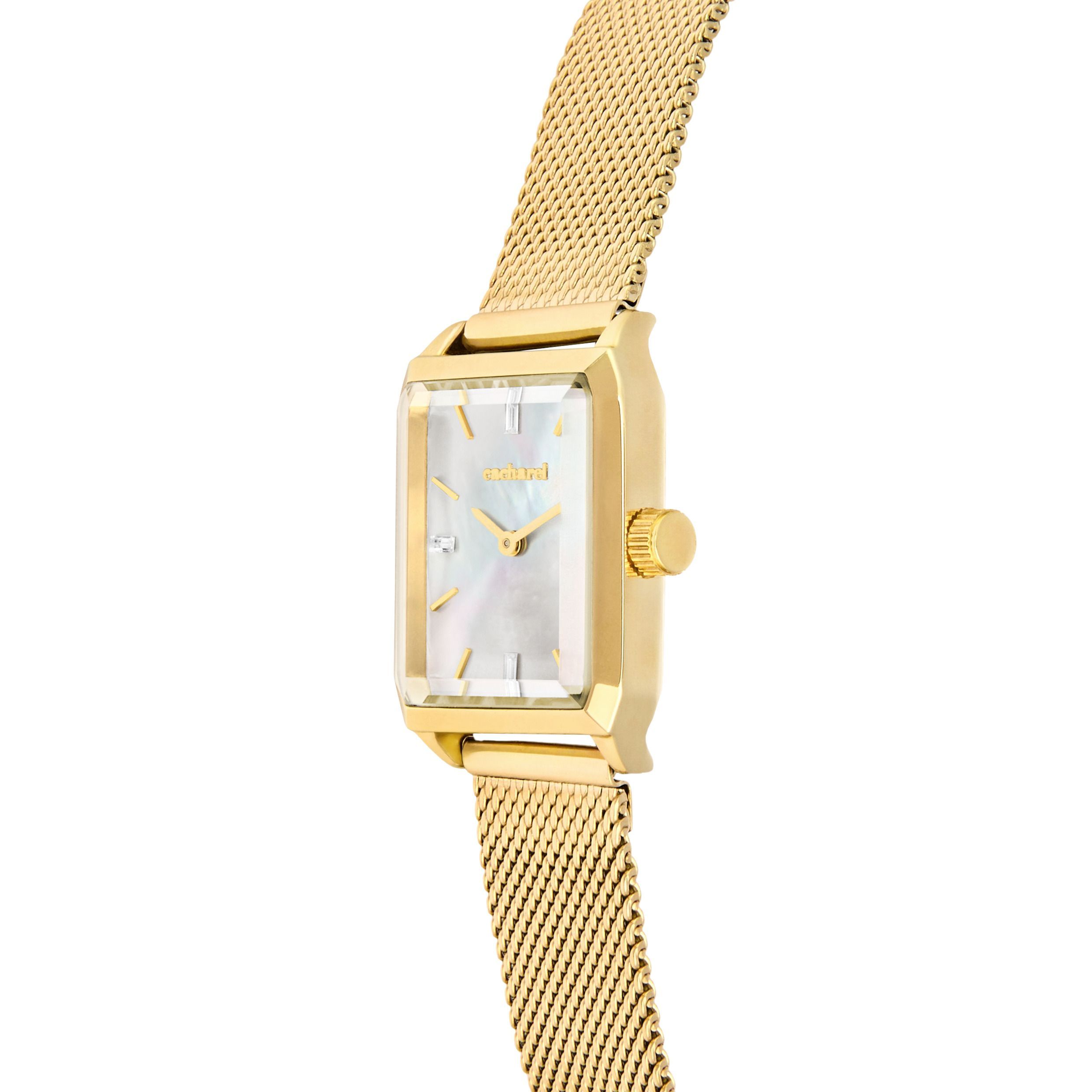 Złoty zegarek Philomène wyróżnia się elegancką bransoletą z siatki mediolańskiej w połączeniu z wyrazistą złotą kopertą, tworząc smukłą i ponadczasową sylwetkę. Tarcza z masy perłowej jest w całości wykończona złotem, a pojedynczy kamień dodaje subtelnego blasku. Idealnie wyważona, kanciasta koperta prezentuje elegancki i ponadczasowy styl.