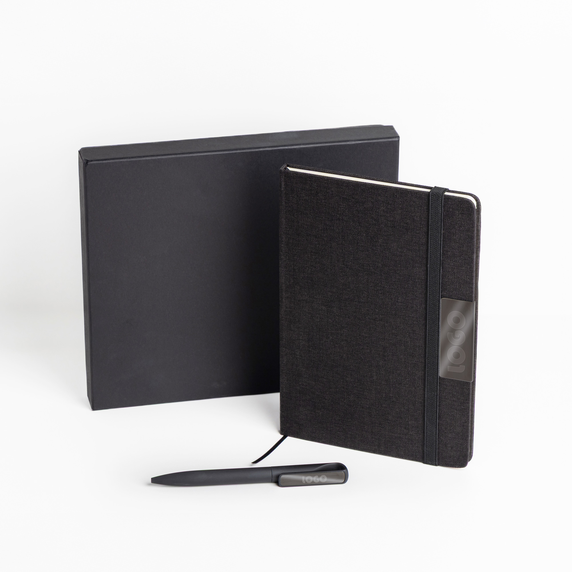 Notes A5 w twardej oprawie z tkaniny RPET, ozdobionej eleganckim metalowym detalem, idealnym pod grawer laserowy. Zawiera 160 stron gładkiego papieru o gramaturze 70 g, z certyfikatem FSC. Do zestawu dołączony jest aluminiowy długopis z gumowaną powłoką i lustrzanym klipsem, również przystosowany do graweru laserowego. Ten wyrafinowany komplet zaprezentowany jest w eleganckim czarnym pudełku z indywidualnymi przegródkami na każdy element.